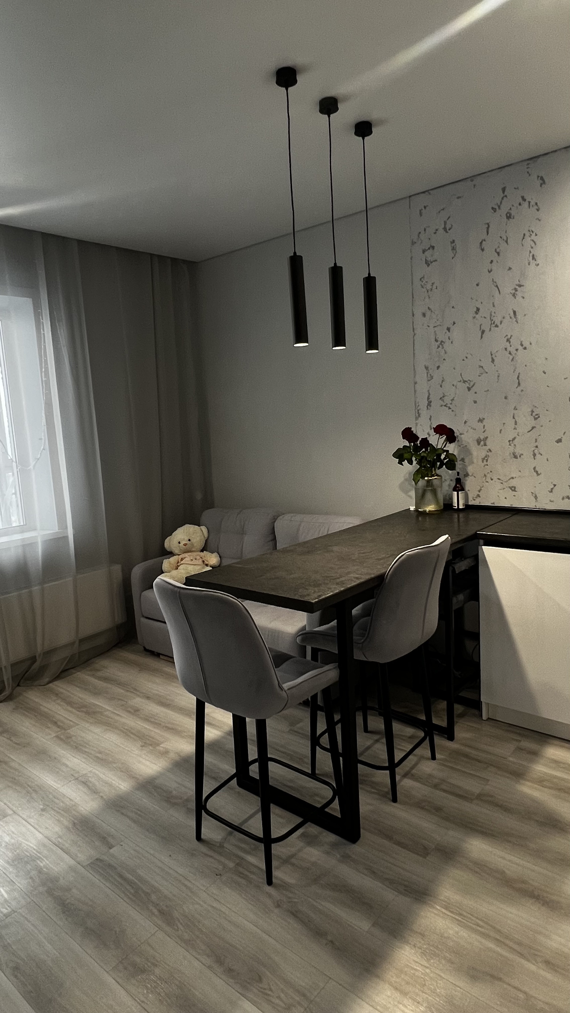 Ремонт сделан менее года назад. Качественные материалы, на полу кварцвиниловая плитка, на стенах декоративная штукатурка, стильный теневой потолок со встроенными спотами.