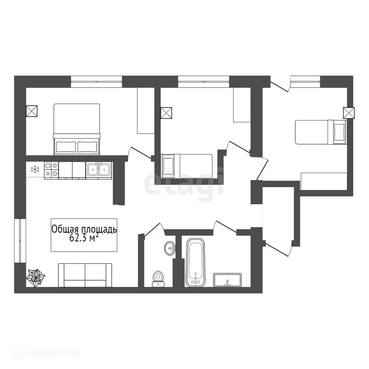 Общая площадь 62.3 м2