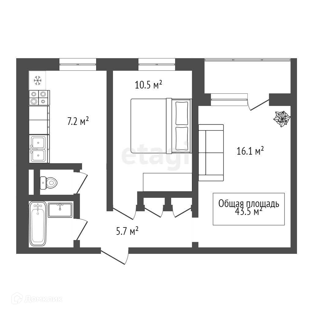 Общая площадь 43.5 м2