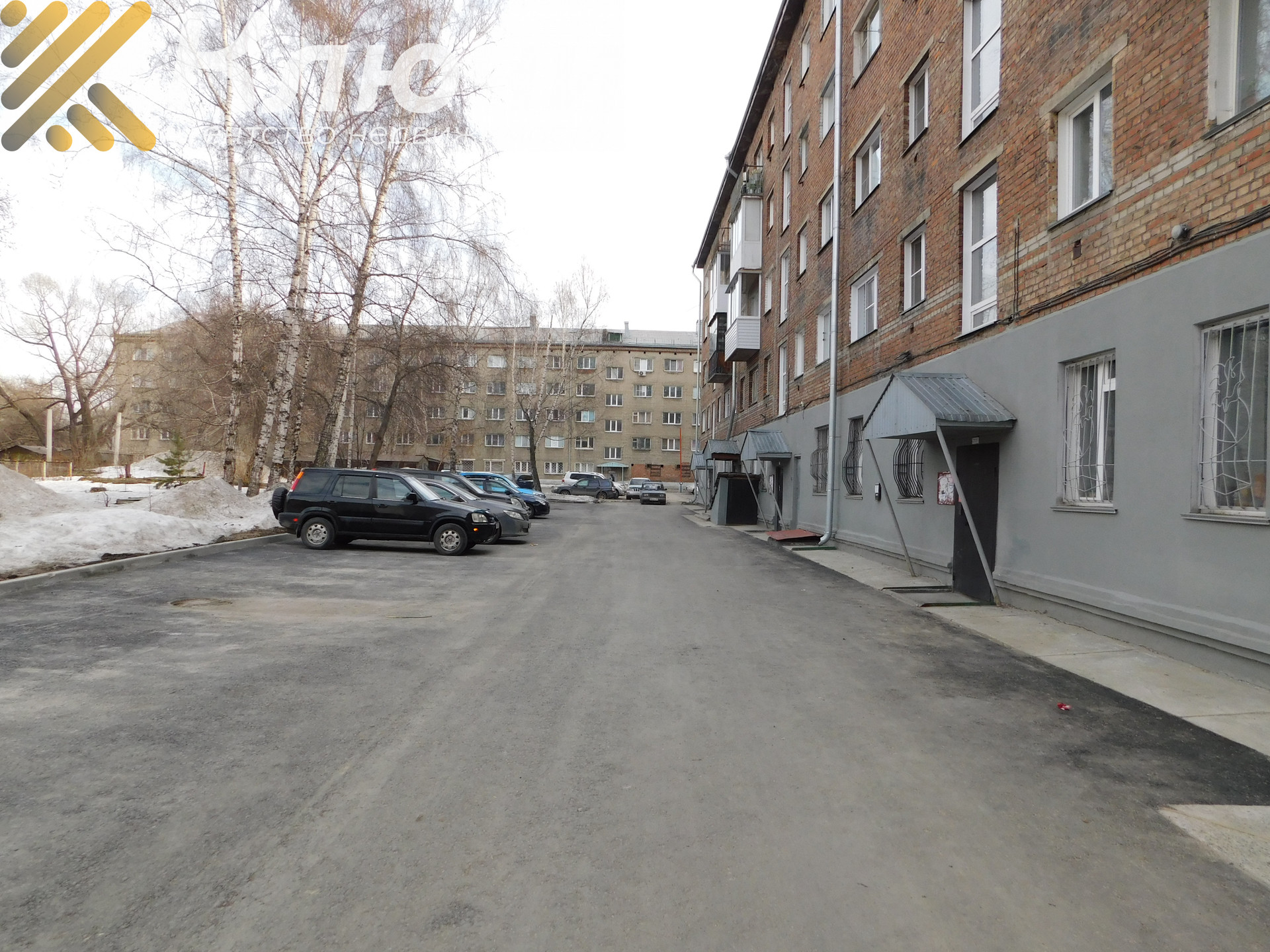 Кирпичный дом, чистый подъезд, большая парковка для авто за шлагбаумом, детская площадка, футбольная коробка, множество зелени во дворе.