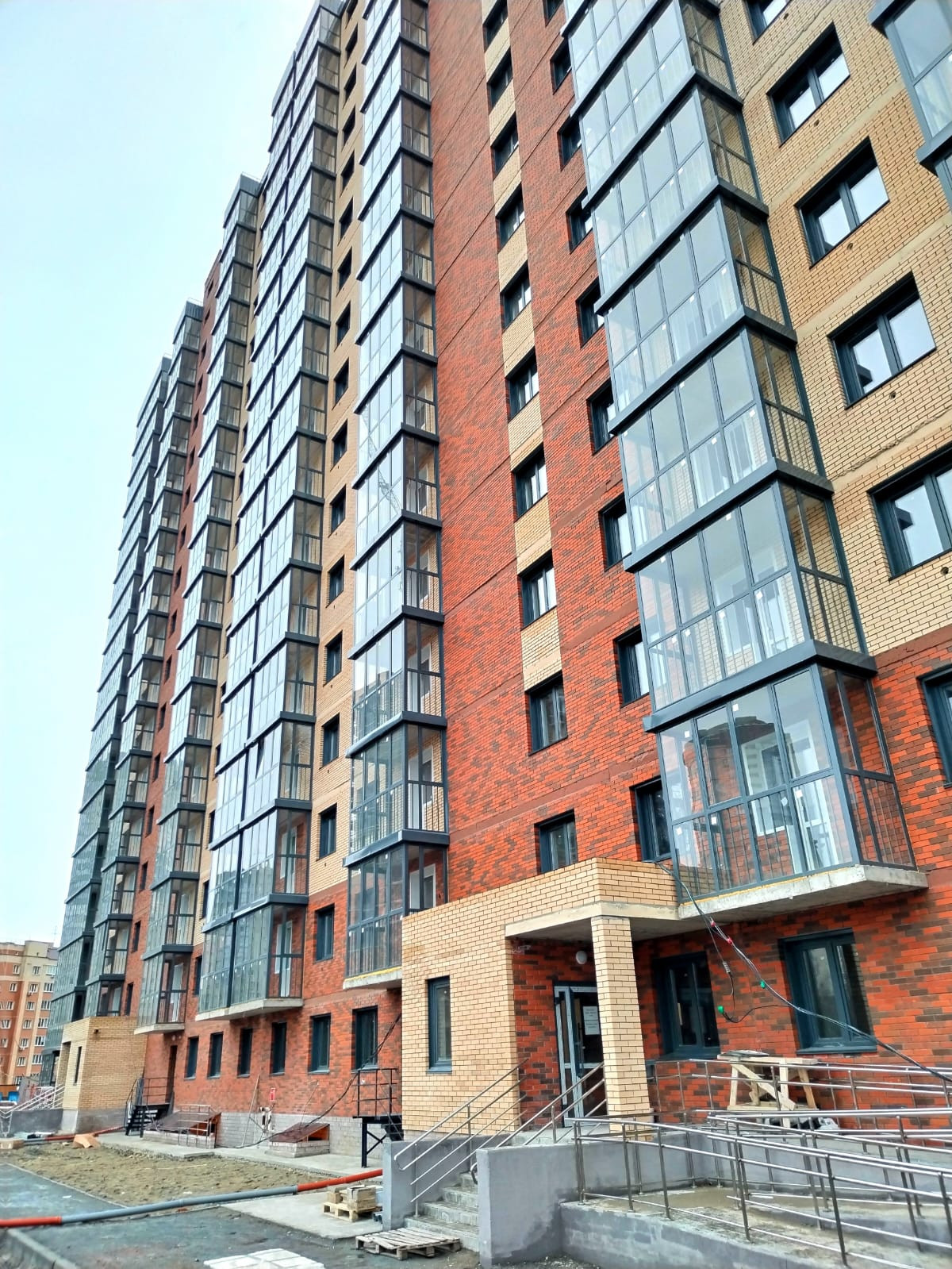 Входные двери установлены в едином проектном стиле.
