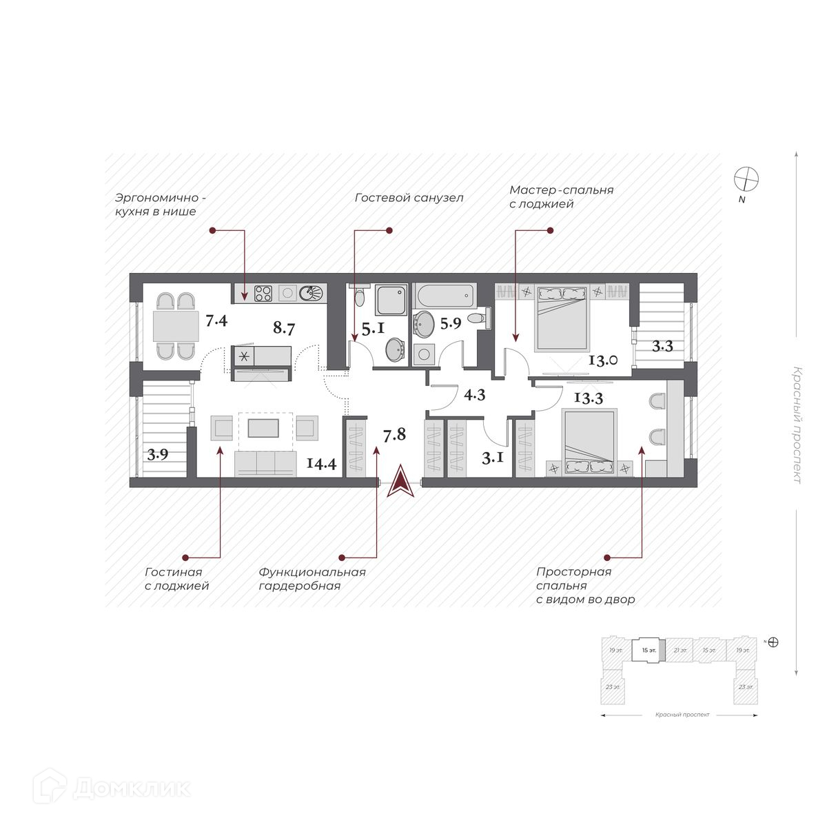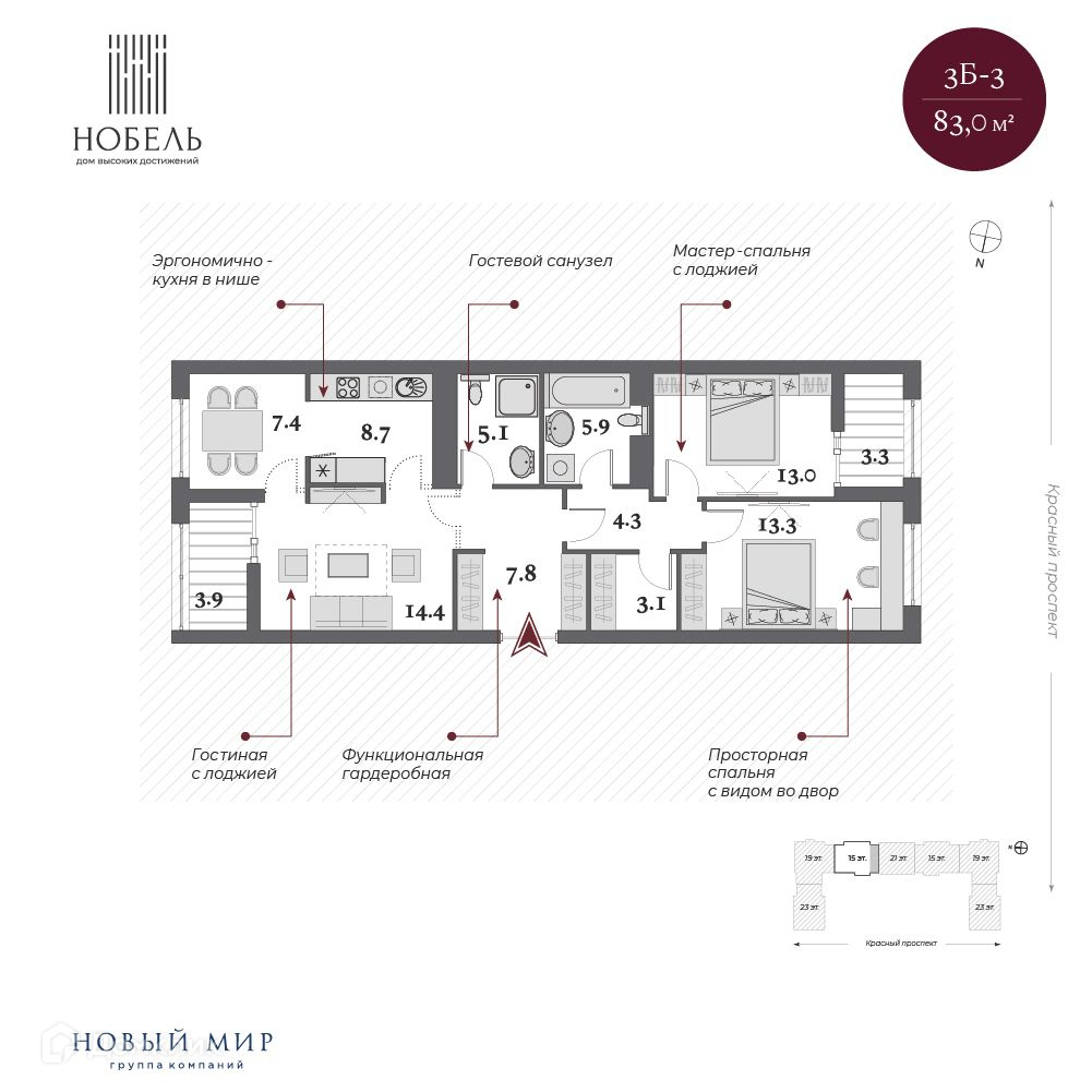 3-комнатная квартира, 85.5 м2, этаж 15 / 23, на продажу в Новосибирске, Красный проспект, 220