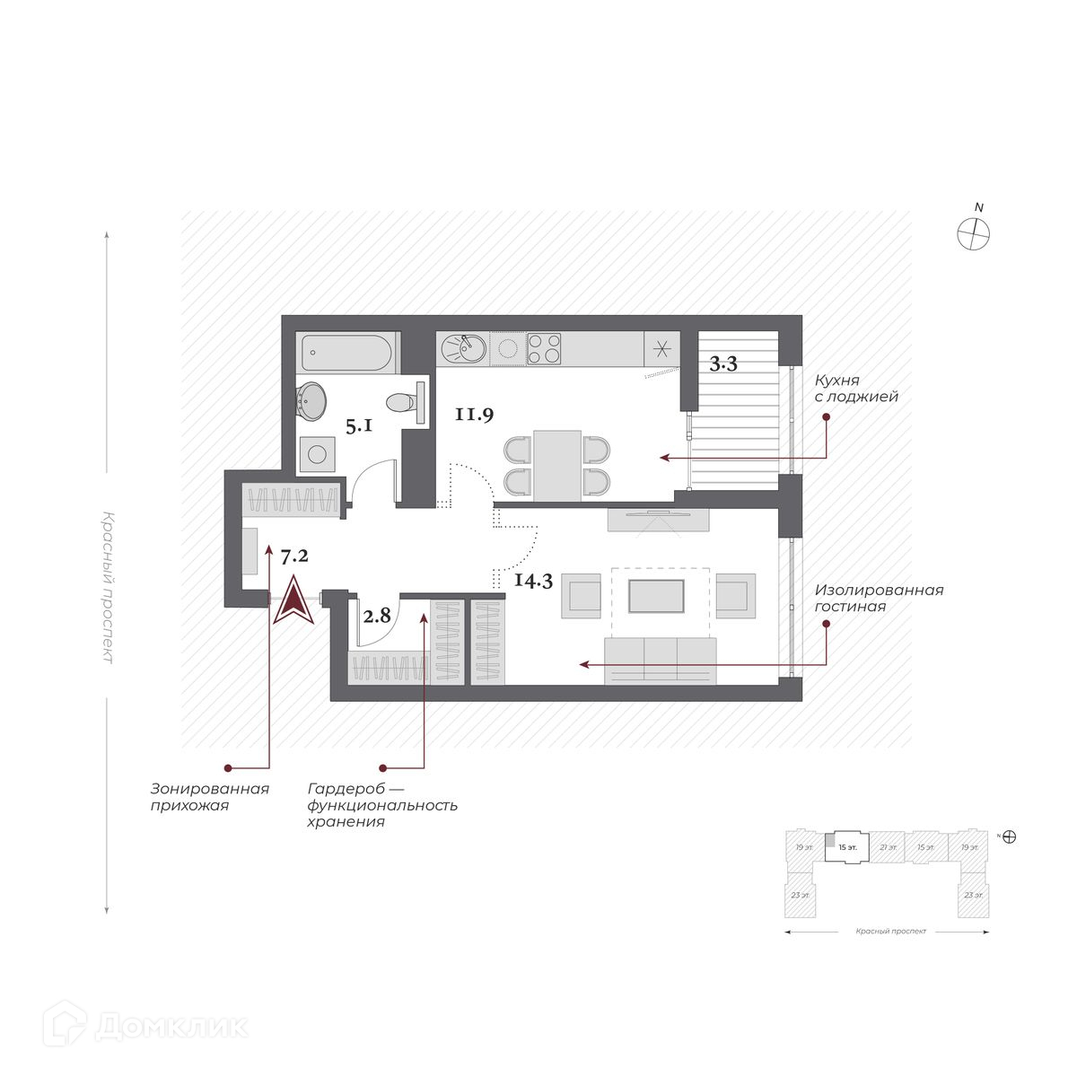 1-комнатная квартира, 43.15 м2, этаж 13 / 23, на продажу в Новосибирске, Красный проспект, 220