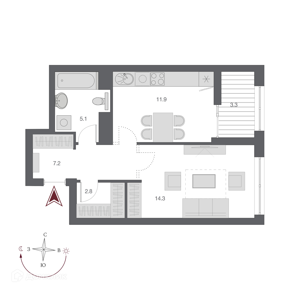 Жилая площадь 14.3 м2