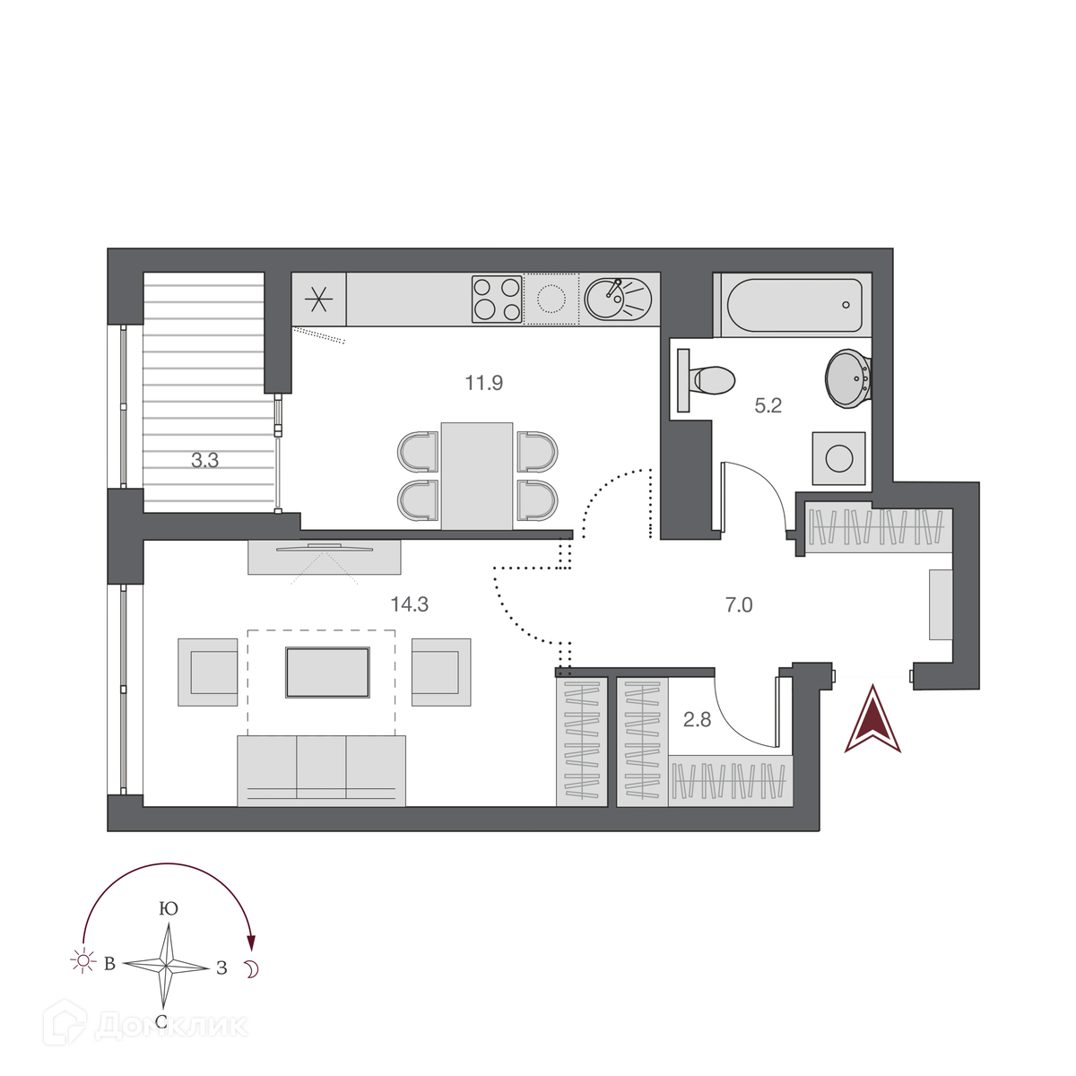 Жилая площадь 14.3 м2
