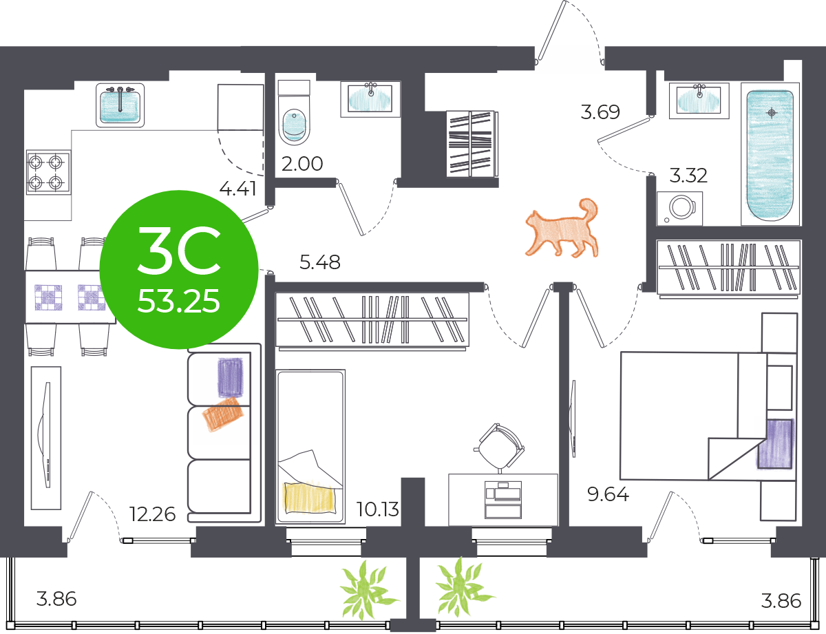 3-комнатная квартира, 51 м2, этаж 13 / 19, на продажу в Новосибирске, 1-я Чулымская улица, 112/2