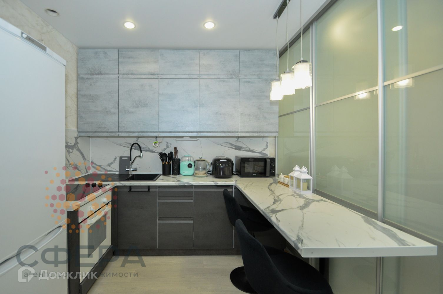 Кухня-гостиная разделена на комфортную кухоную и приватную жилую зоны.