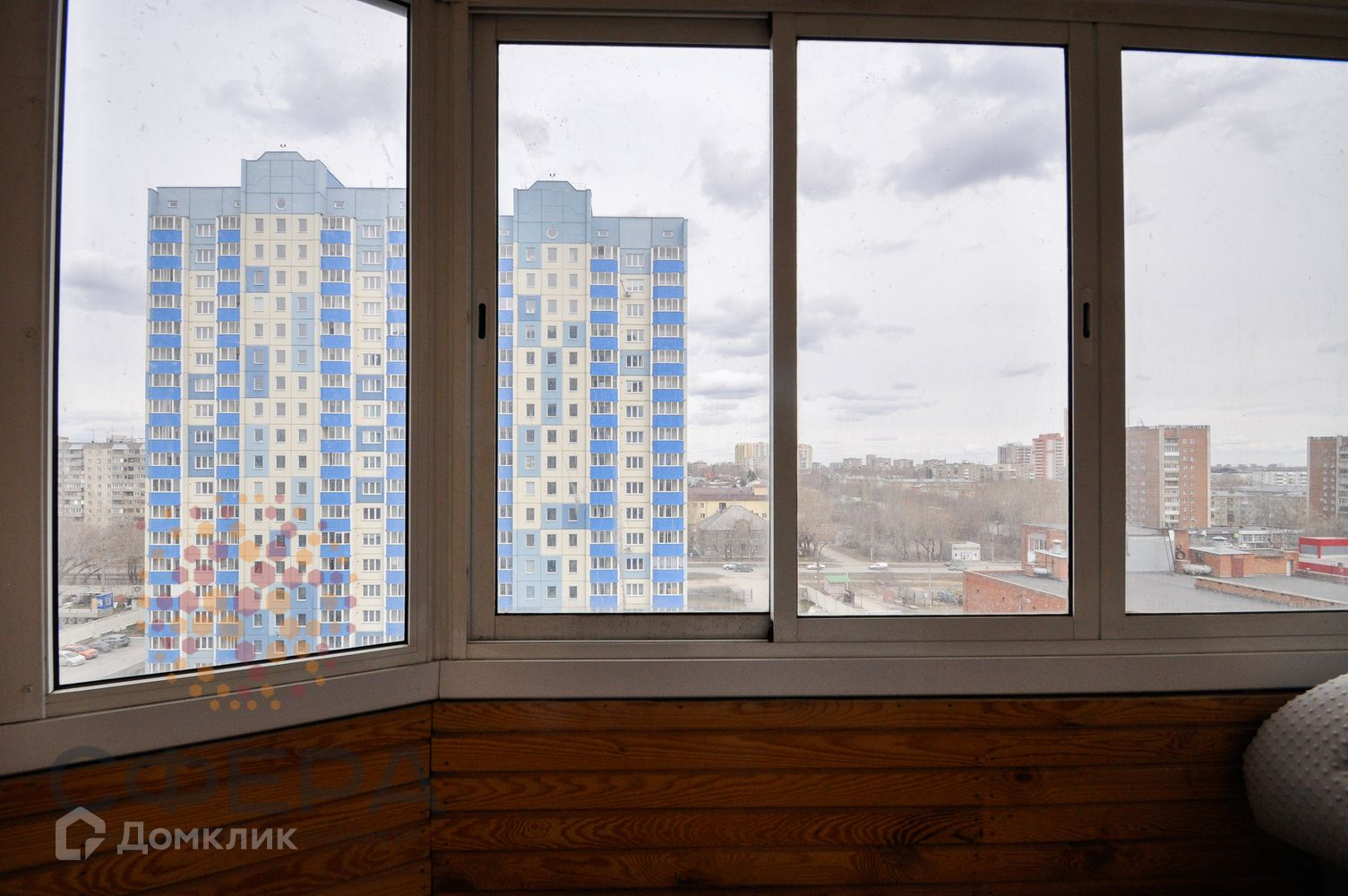Большая лоджия остеклена. Окна выходят на две стороны.