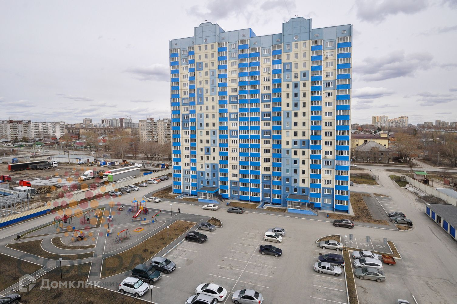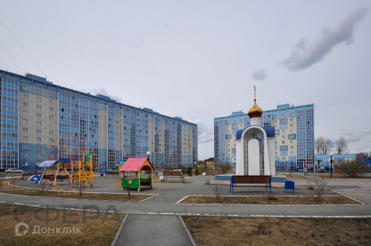 Во дворе дома большая детская площадка.