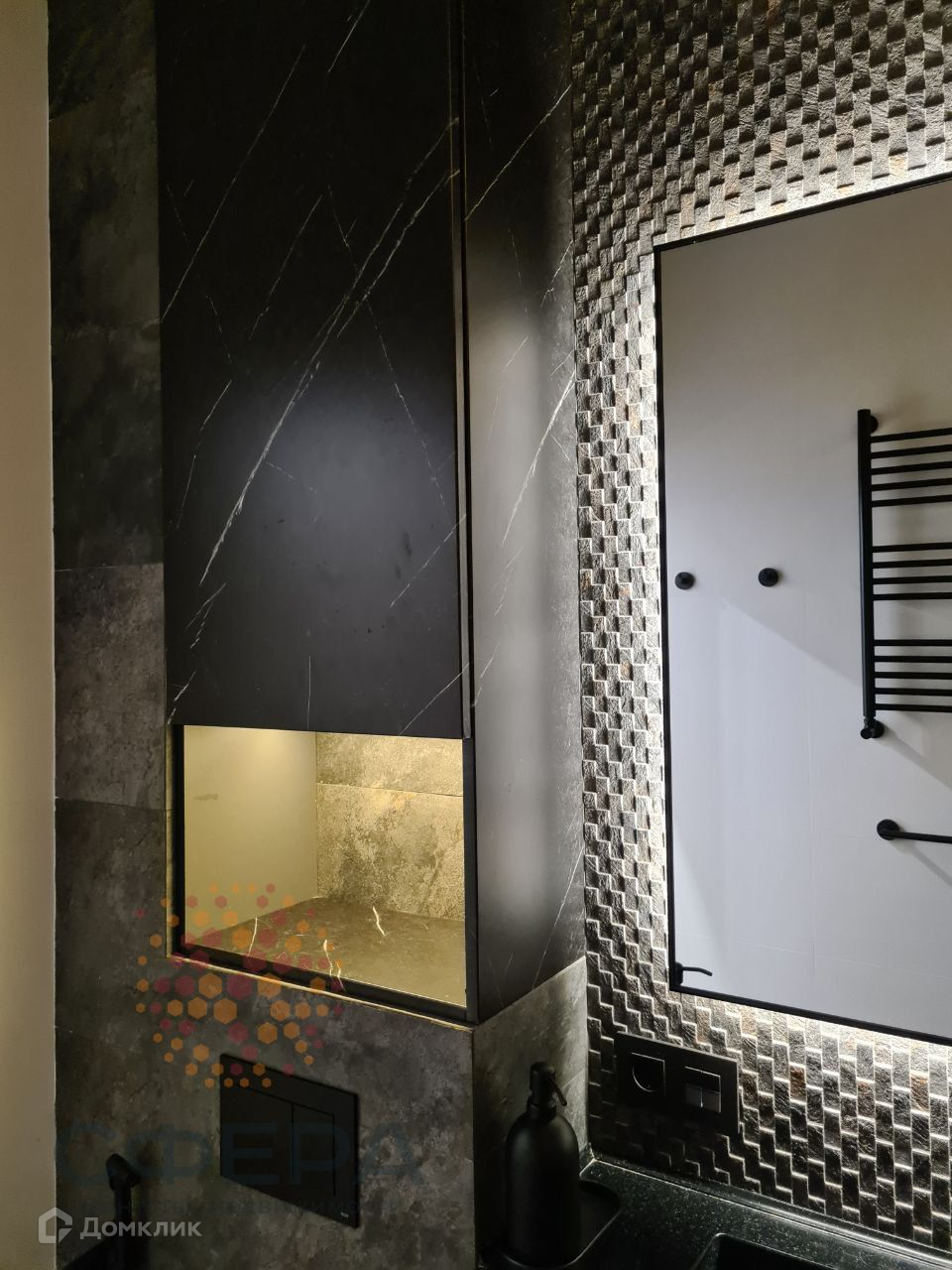 4. в санузле японская сантехника Omoikiri , инсталляция TECE, испанская плитка Venis, встроенная зона хранения, в которой установлен водонагреватель;
