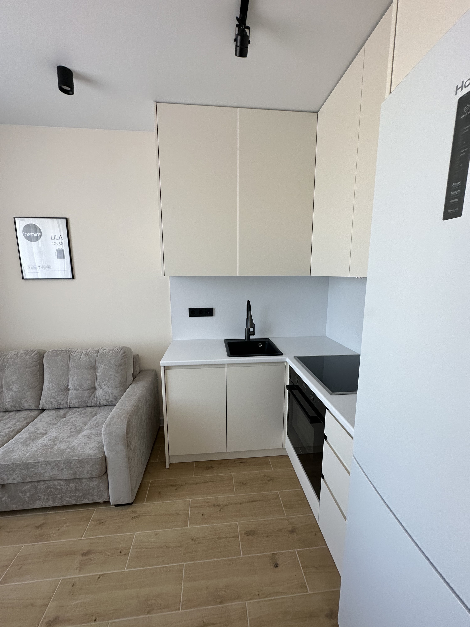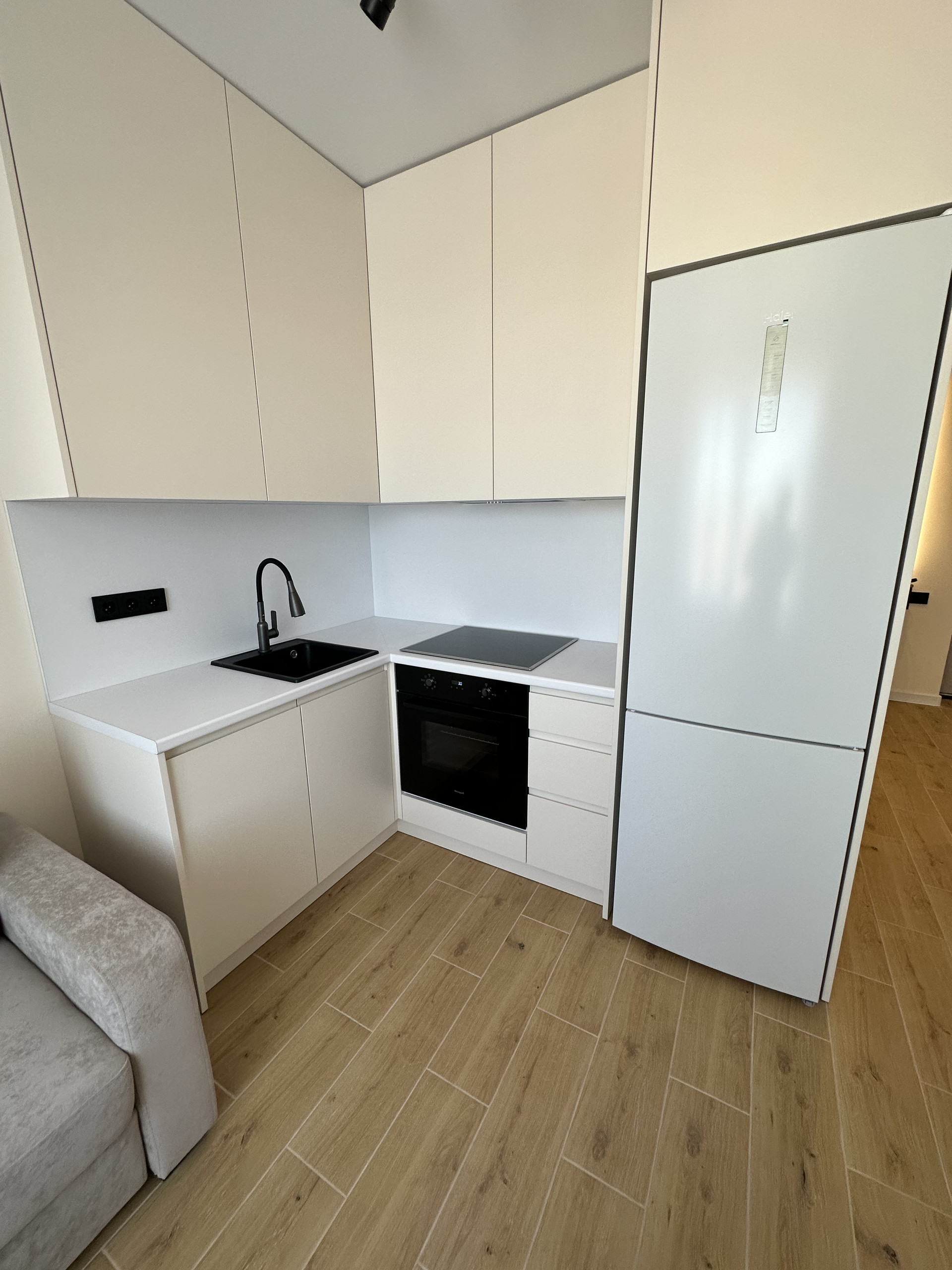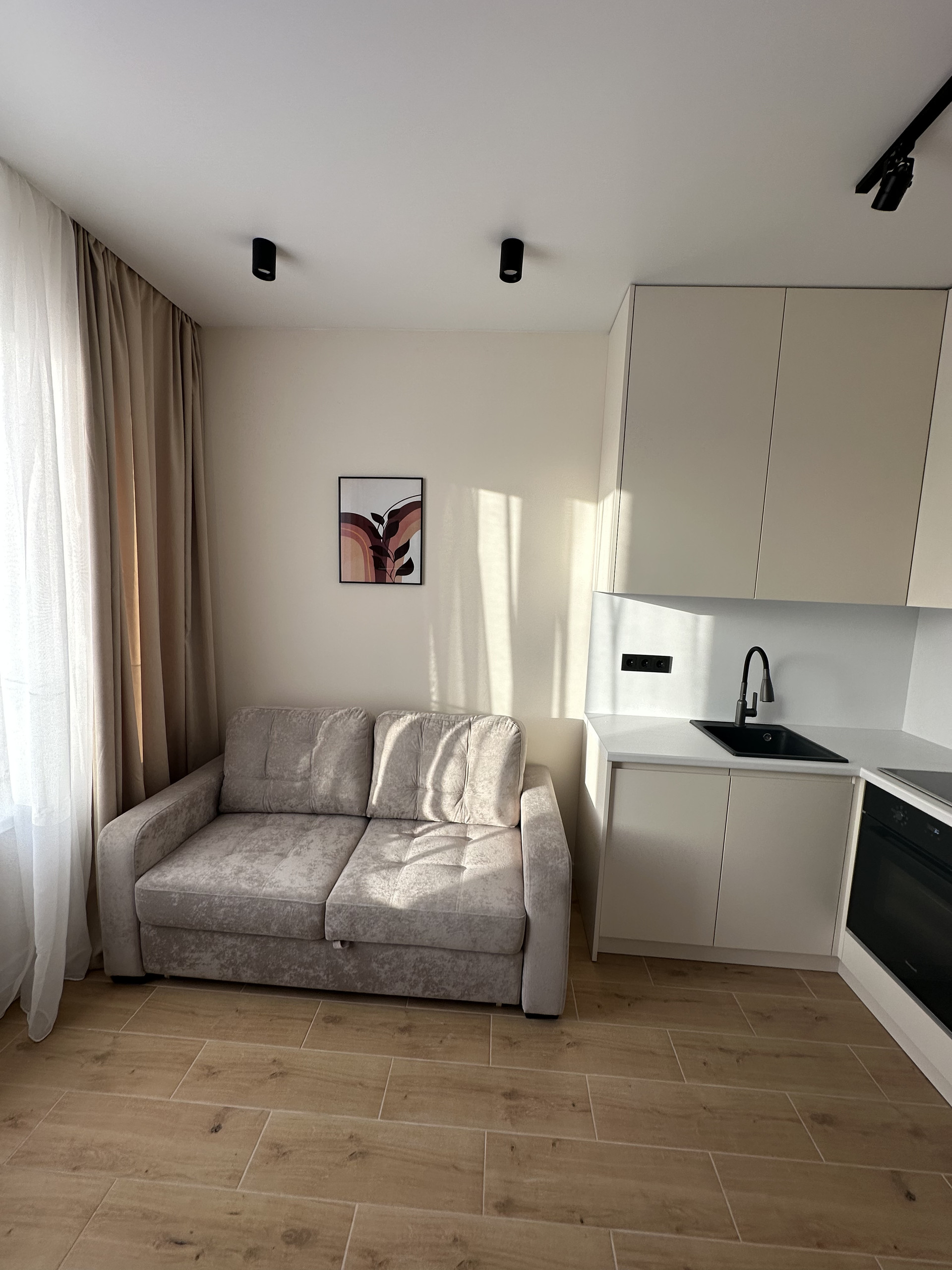 Кухонная зона предусматривает все необходимое для комфортного использования. Диван раскладывается и превращается в полноценное двуспальное место сна.