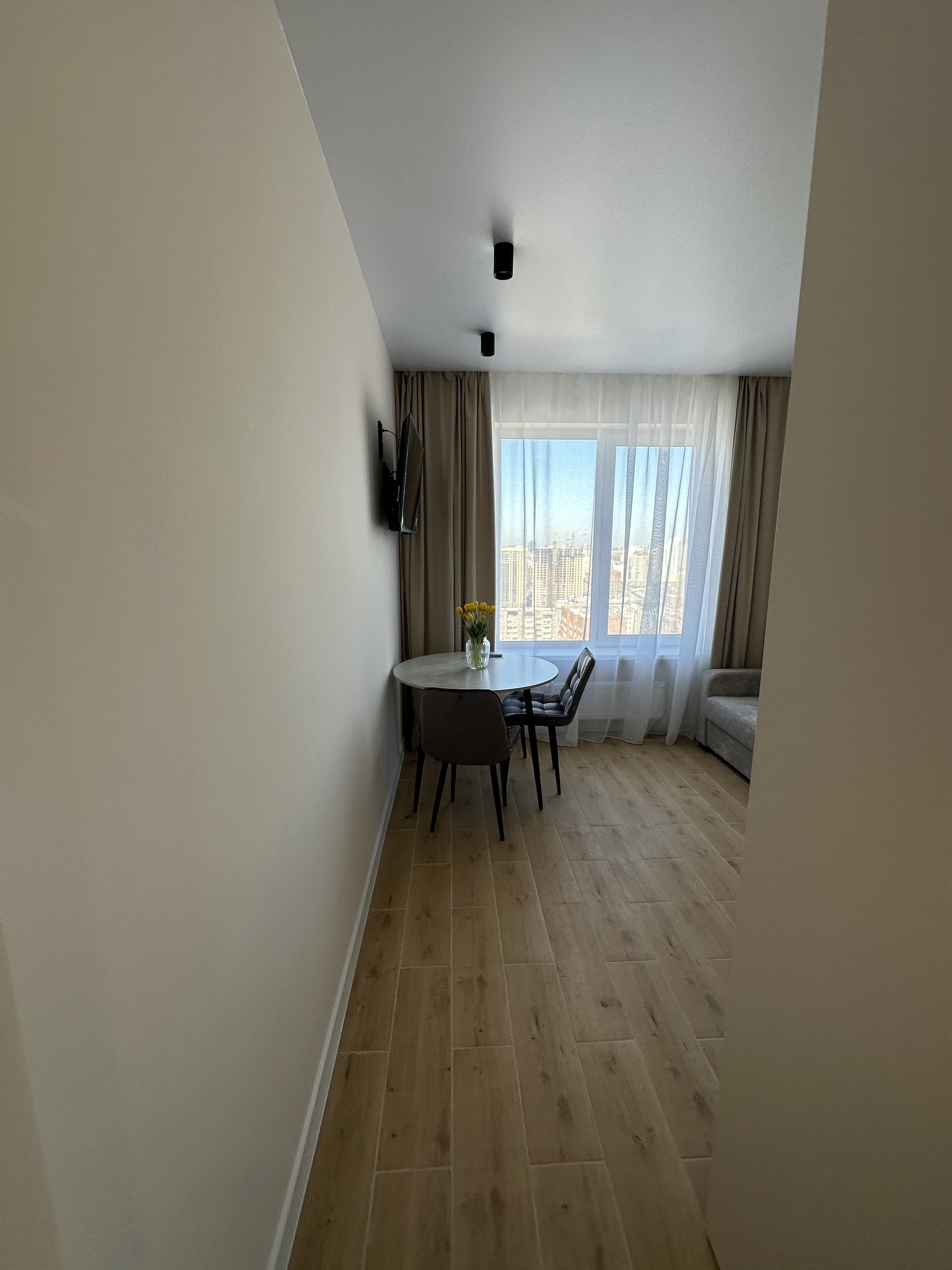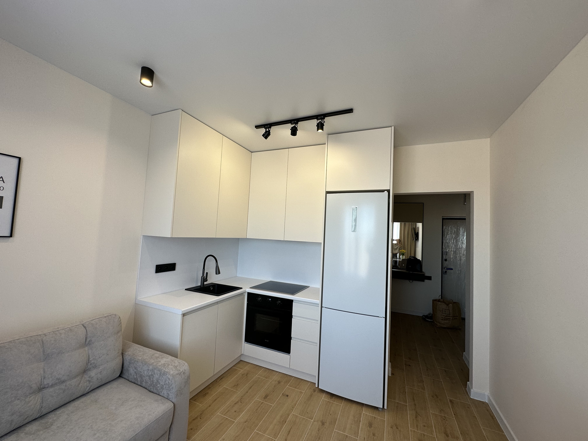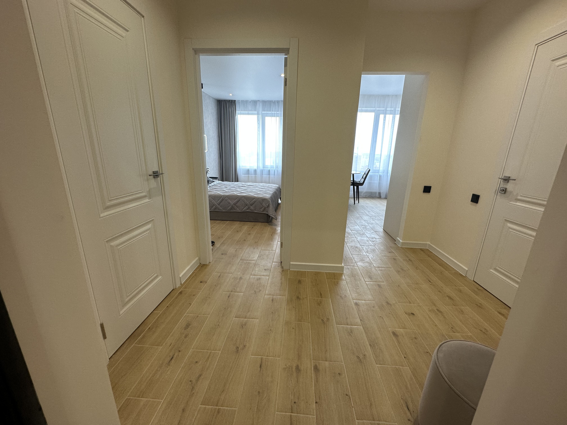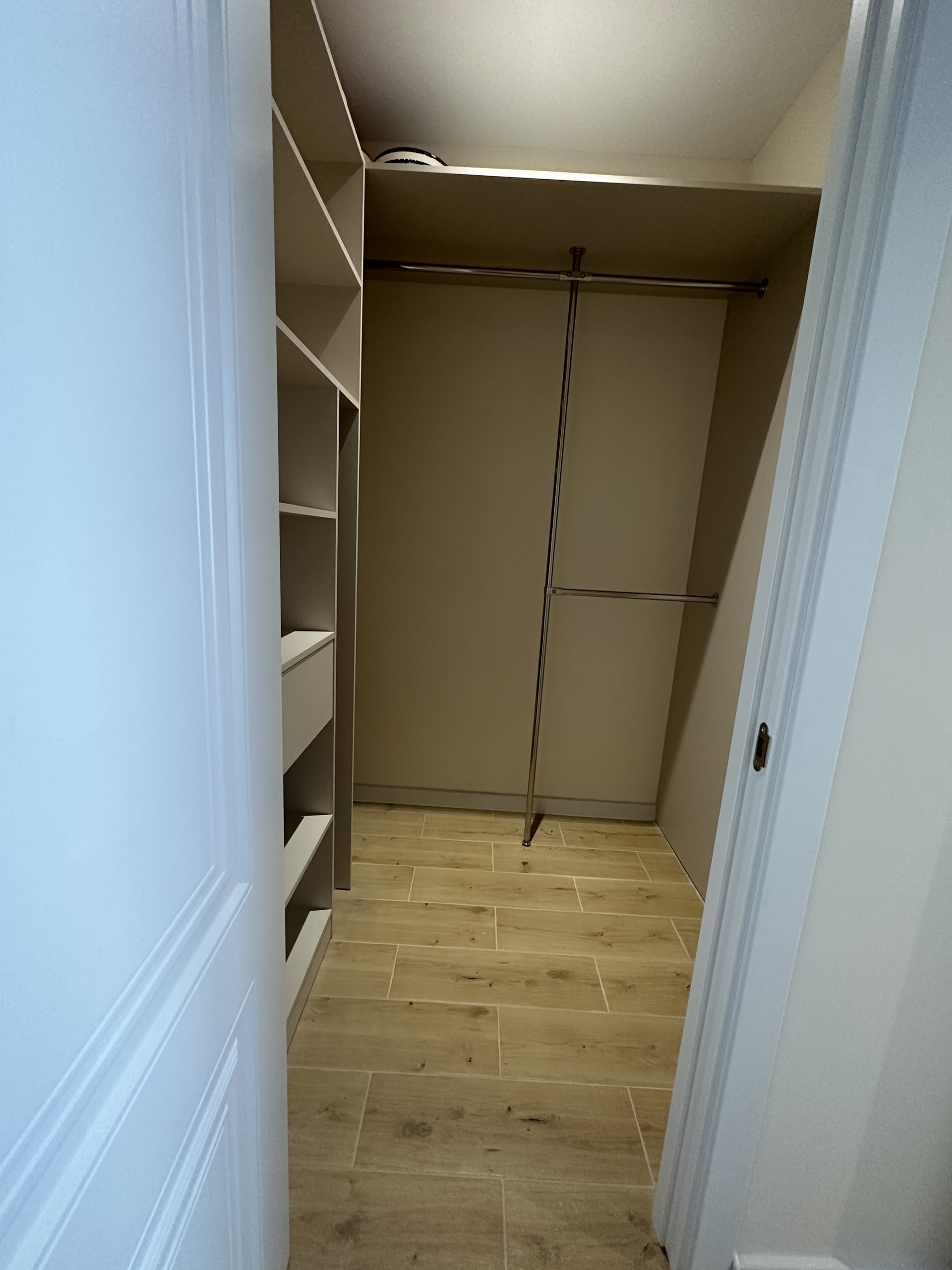 Имеется отдельная гардеробная комната изготовлена из ЛДСП Egger , в которую можно убрать из вида лишние вещи и устранить визуальный шум в жилой зоне.