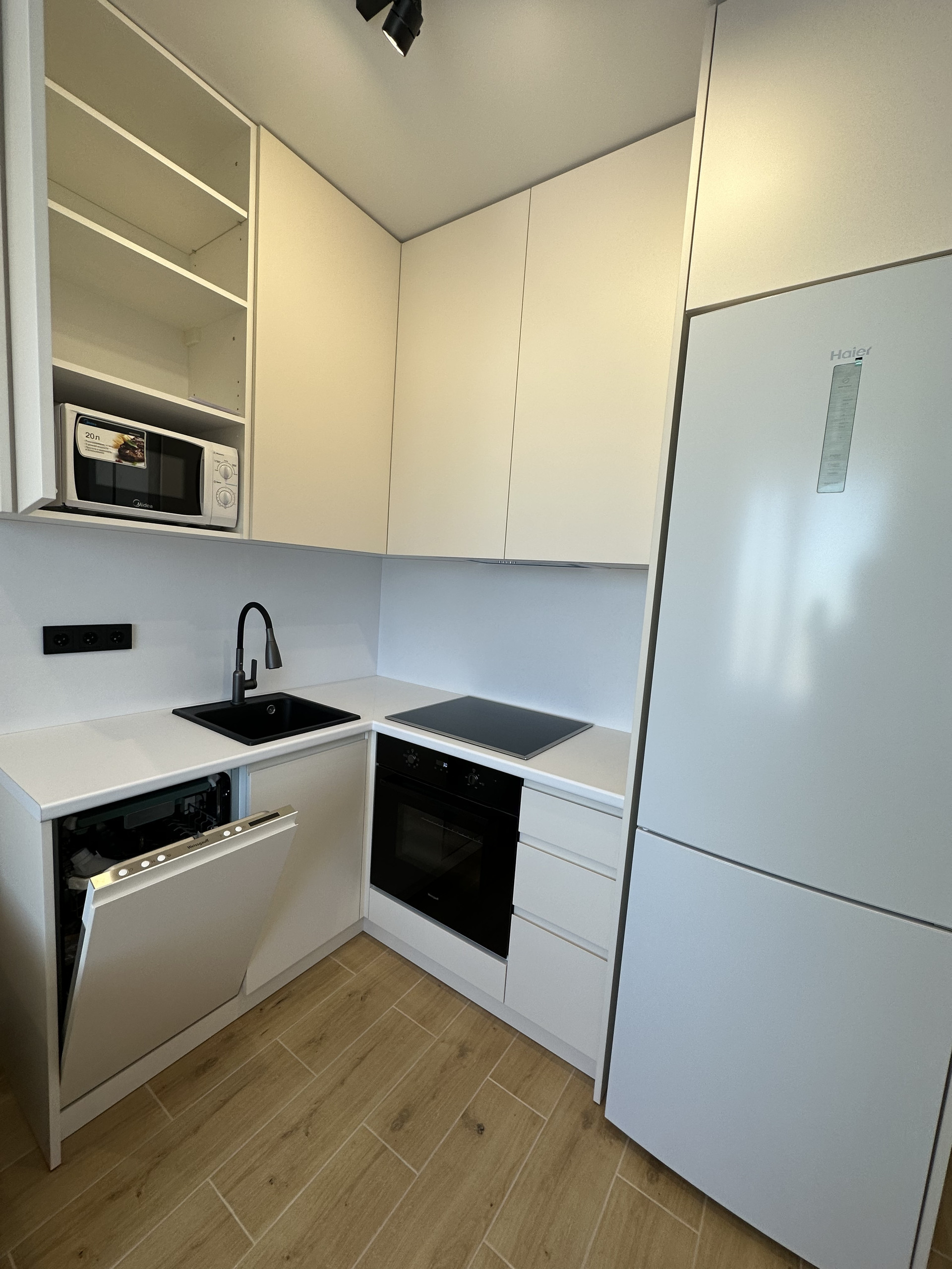 Кухонный гарнитур изготовлен на заказ по индивидуальным параметрам с фасадами МДФ эмаль , установлена встроенная посудомоечная машина.