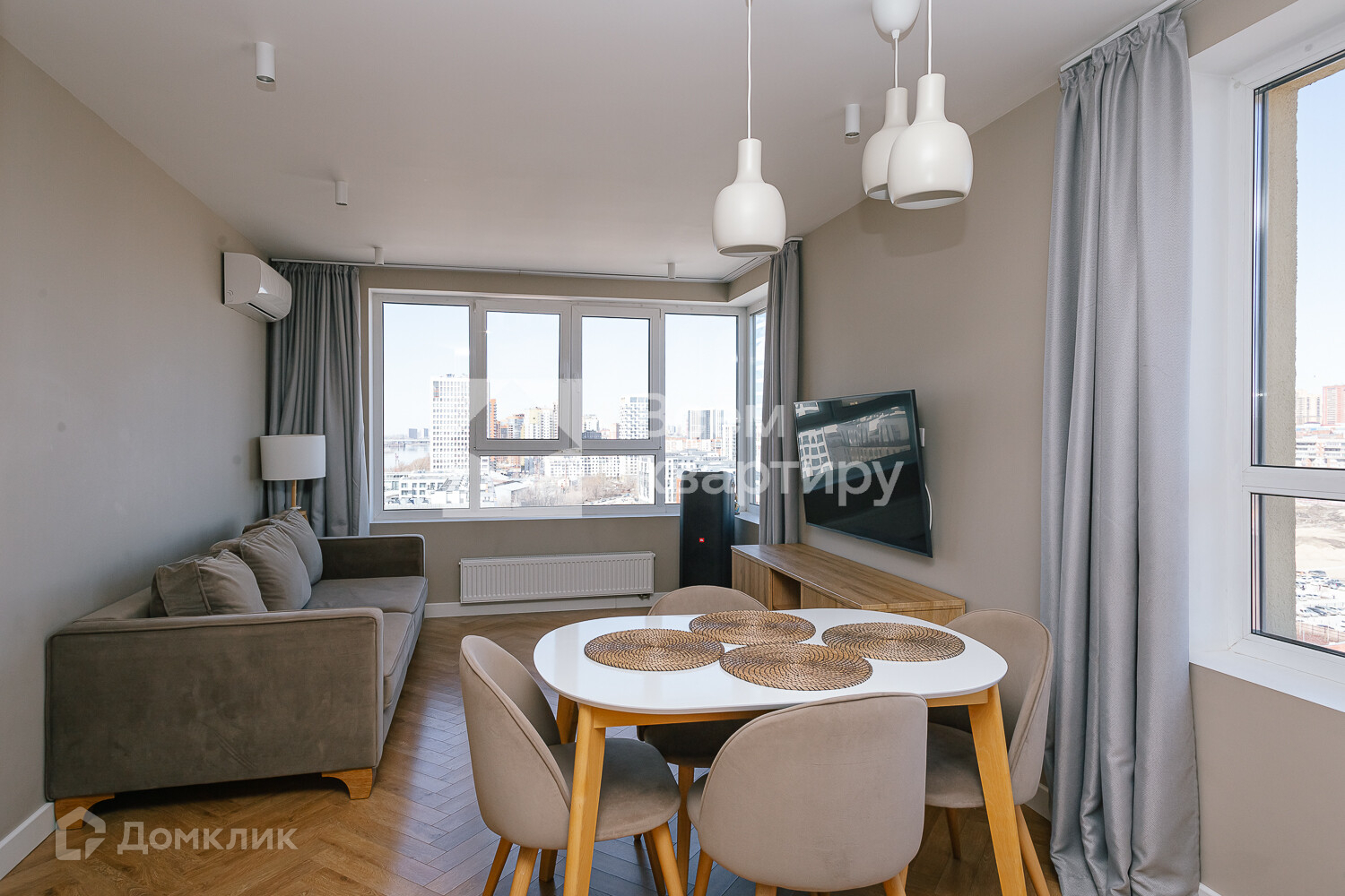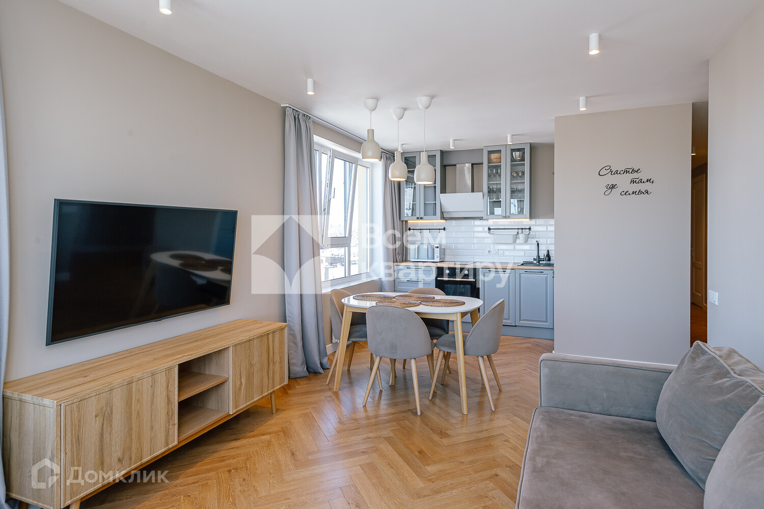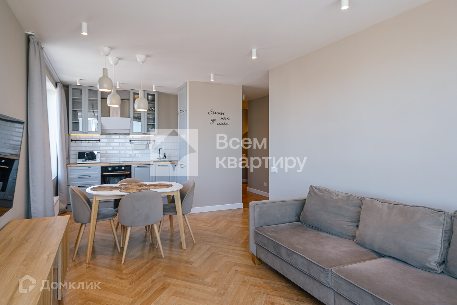 шкафами, встроенная вытяжка Bosch, встроенная варочная поверхность Midea, встроенный духовой шкаф Midea, встроенная посудомоечная машина Midea, измельчитель, холодильник Midea, диван, стол и стулья на кухне. В комнатах вся мебель, которая есть на фотографиях, телевизор LG. В ванной комнате стиральная машина Hotpoint Ariston с функцией cушки, водонагреватель termex.