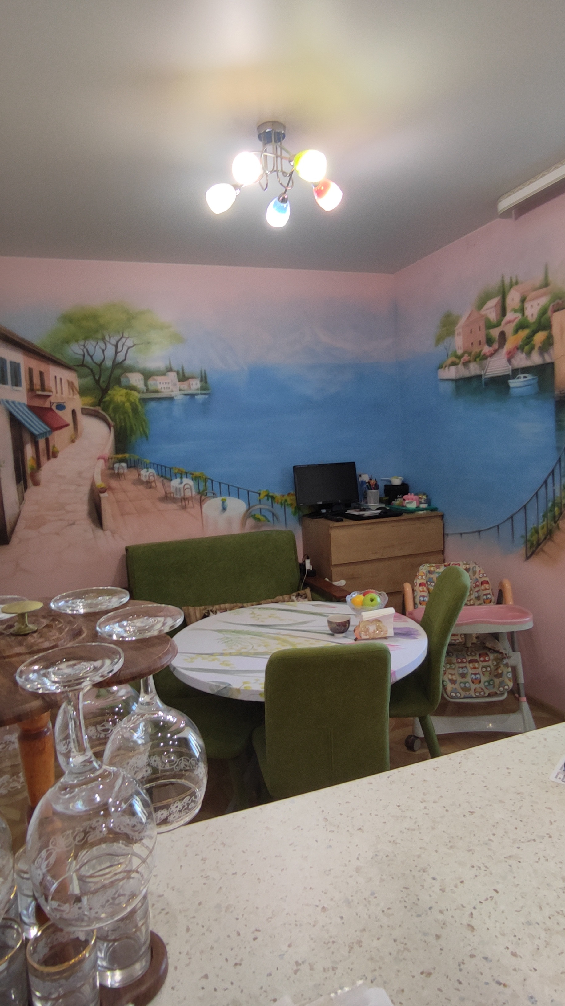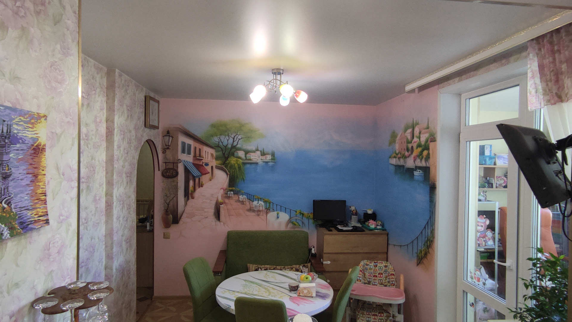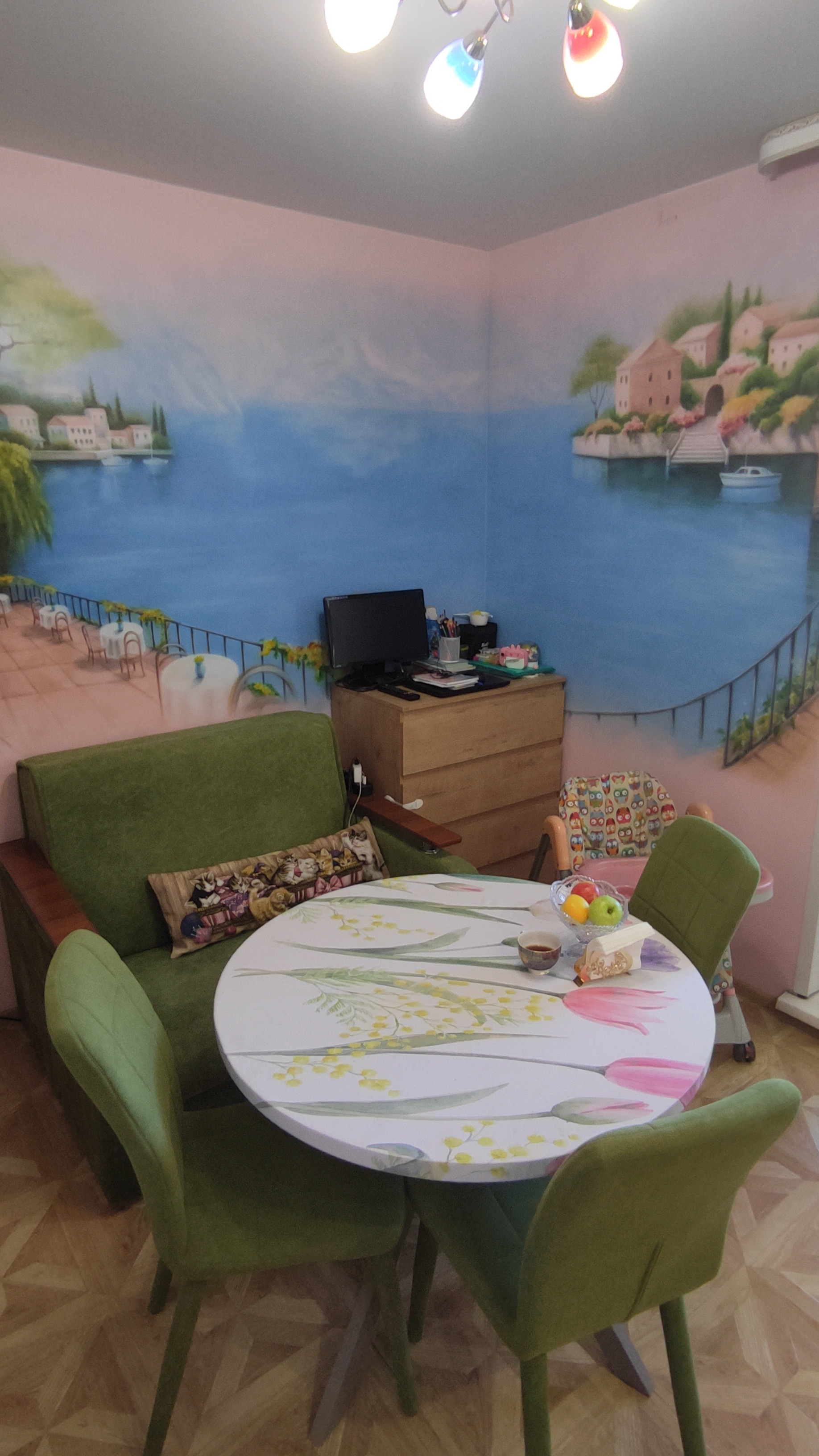 -Стена в детской и большая угловая стена в кухне: вместо обоев красочная аэрографика под лаком.