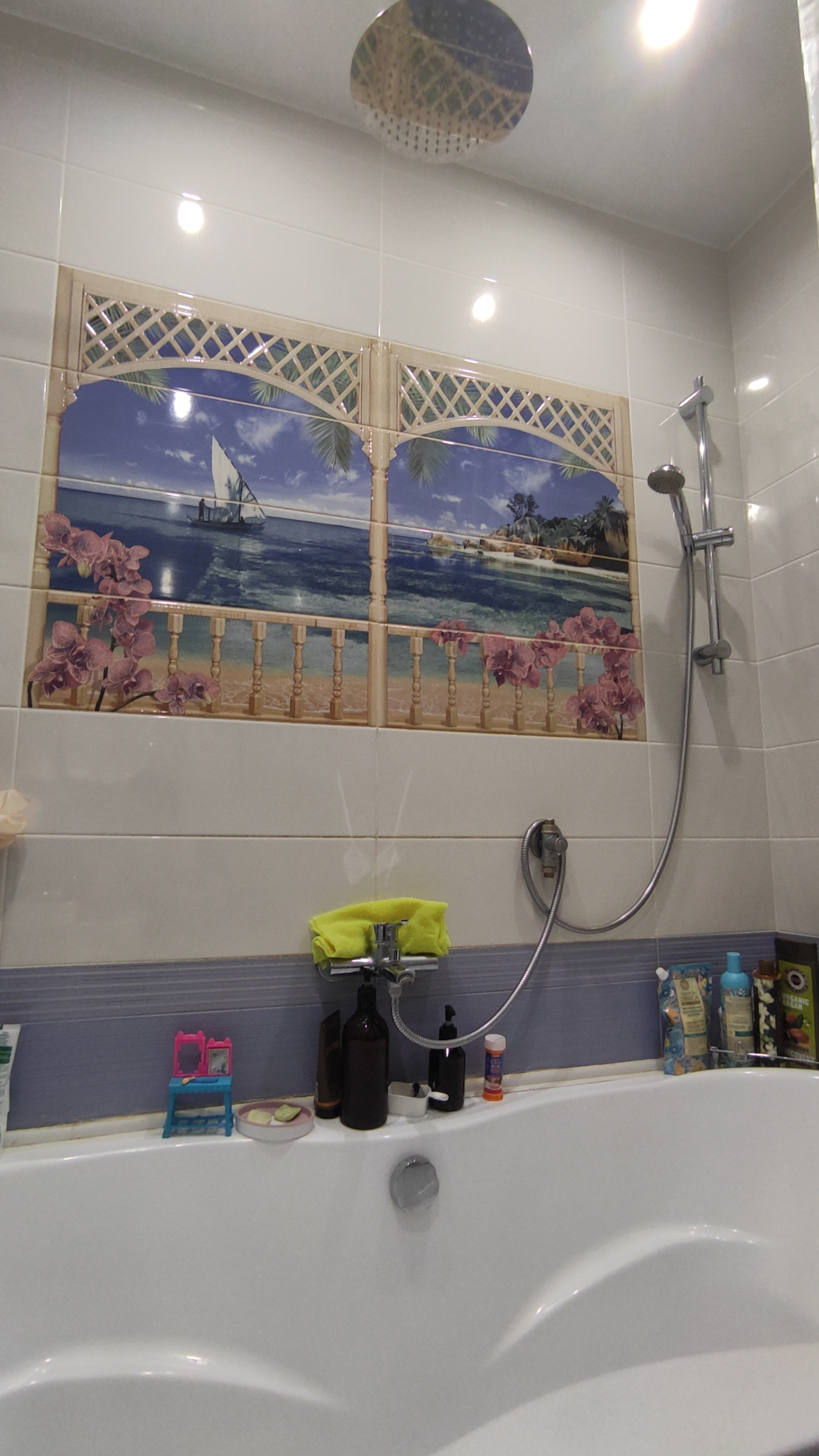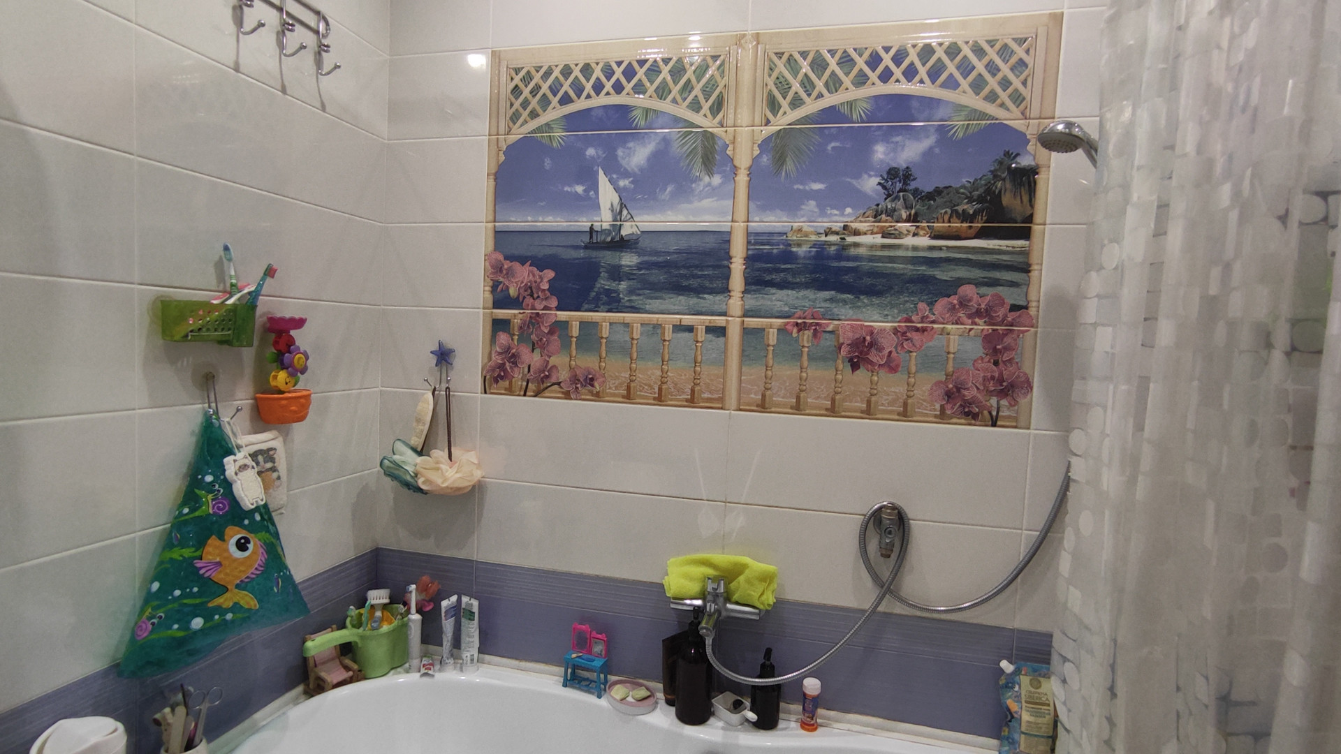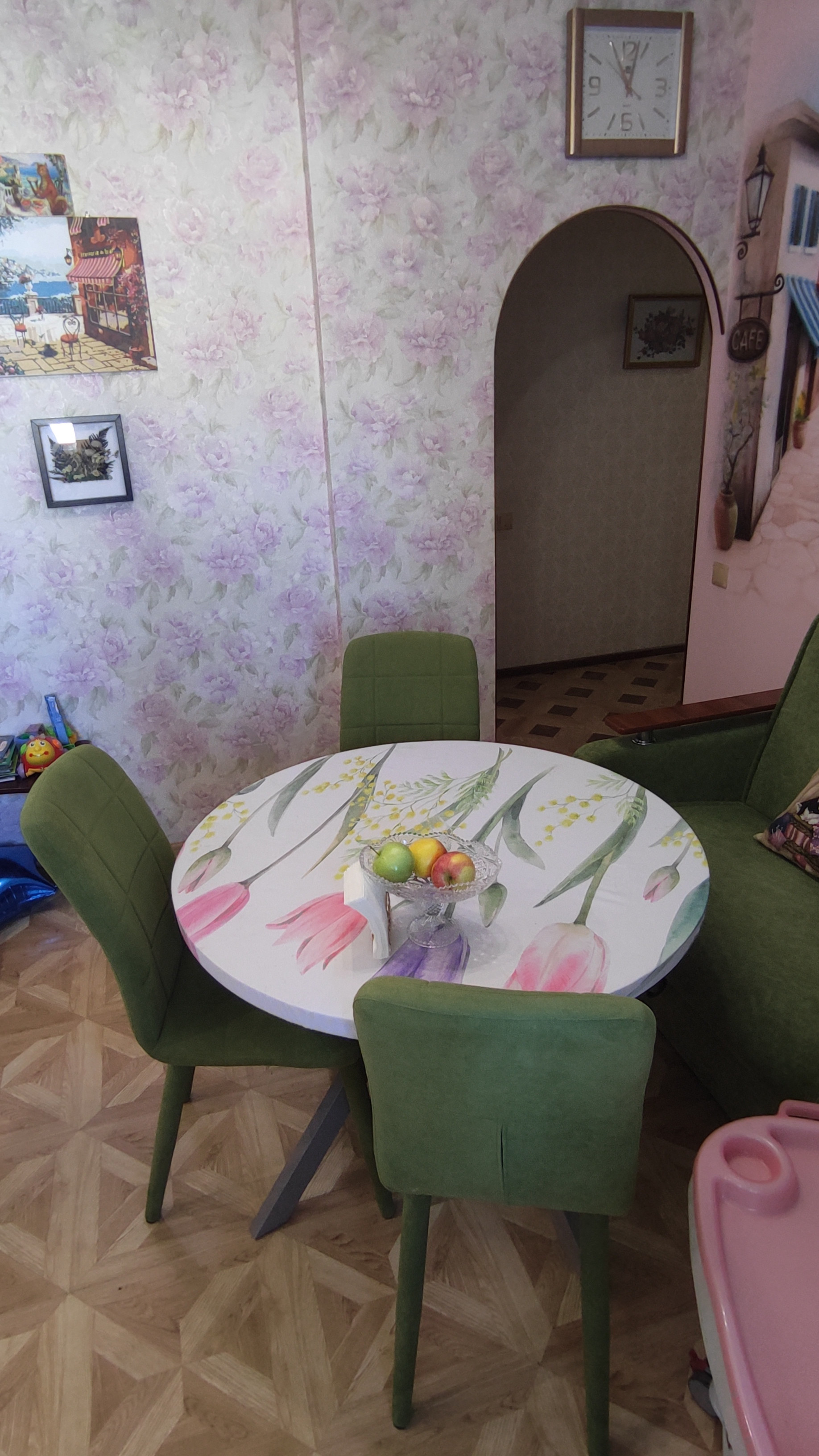 -Стена в детской и большая угловая стена в кухне: вместо обоев красочная аэрографика под лаком.