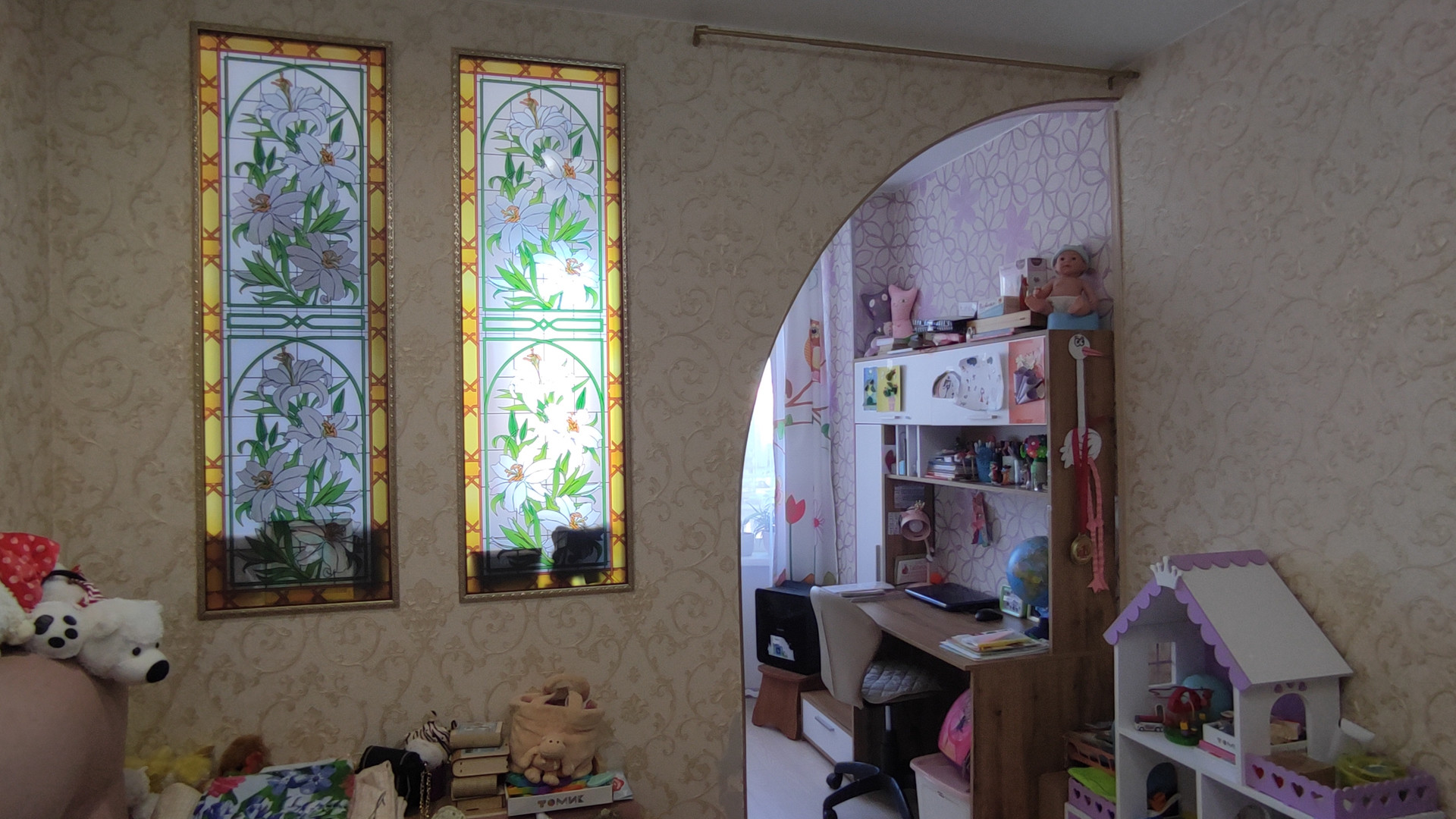 комнаты у окна, в перегородке  витражи.