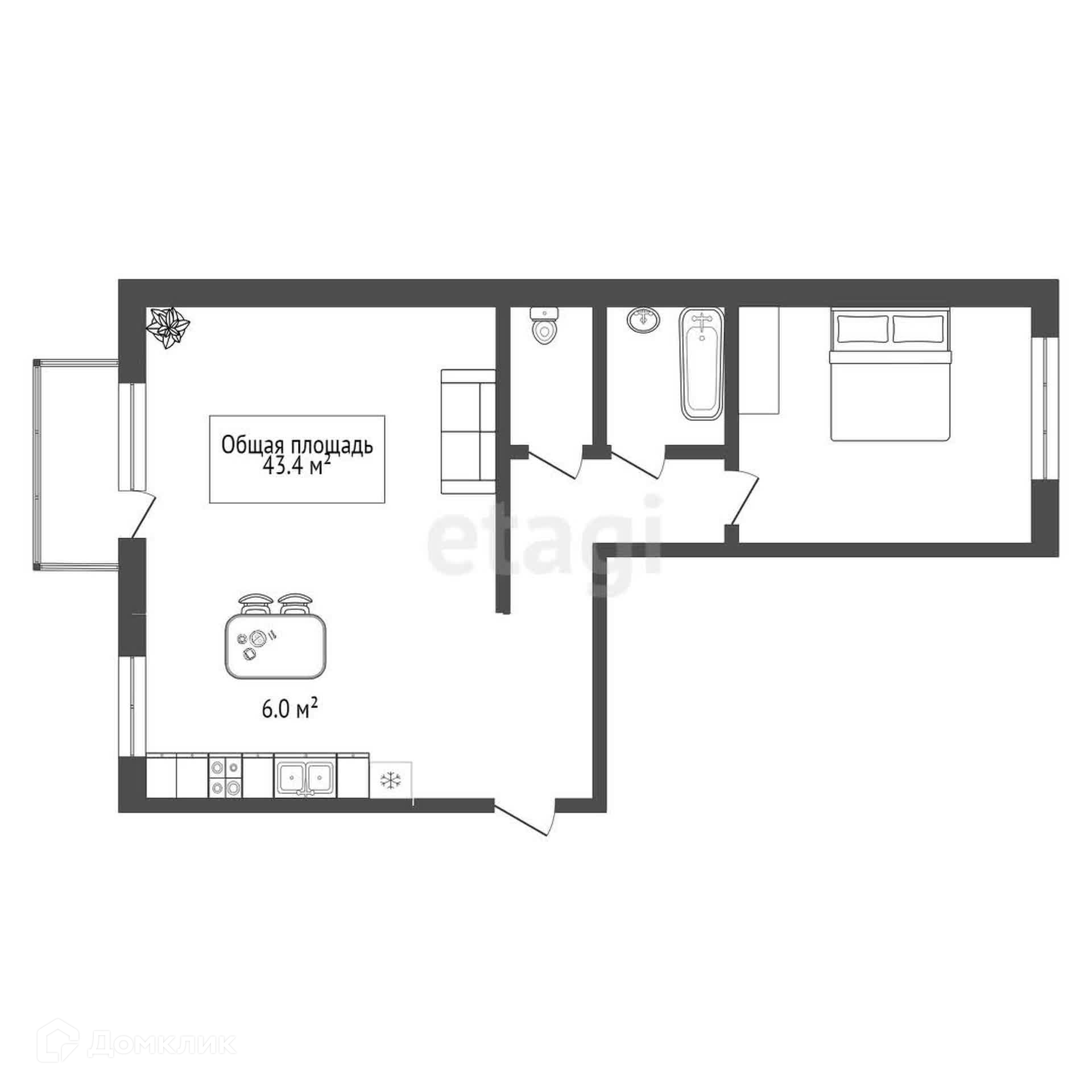 Общая площадь 43.4 м2