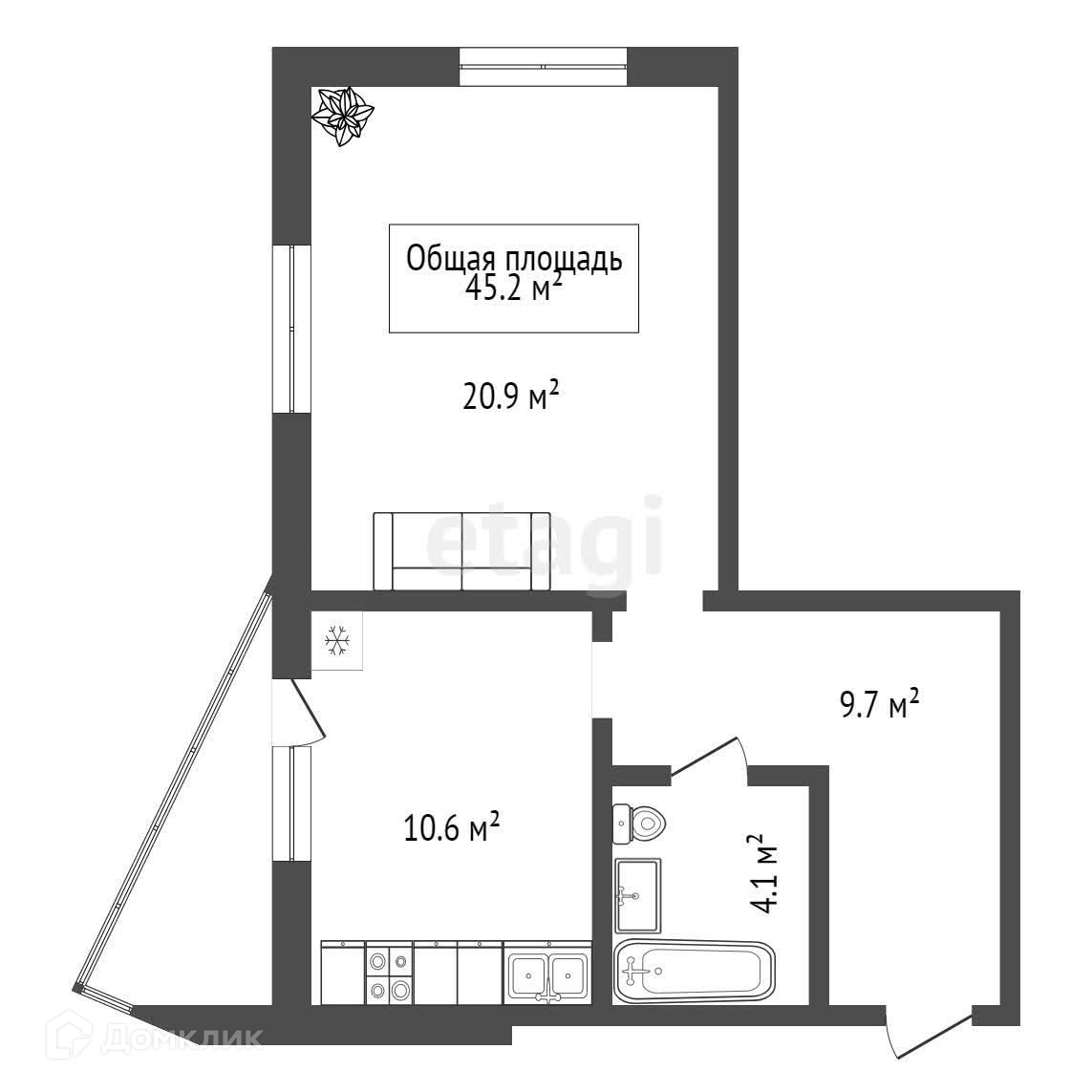 Общая площадь 45.3 м2