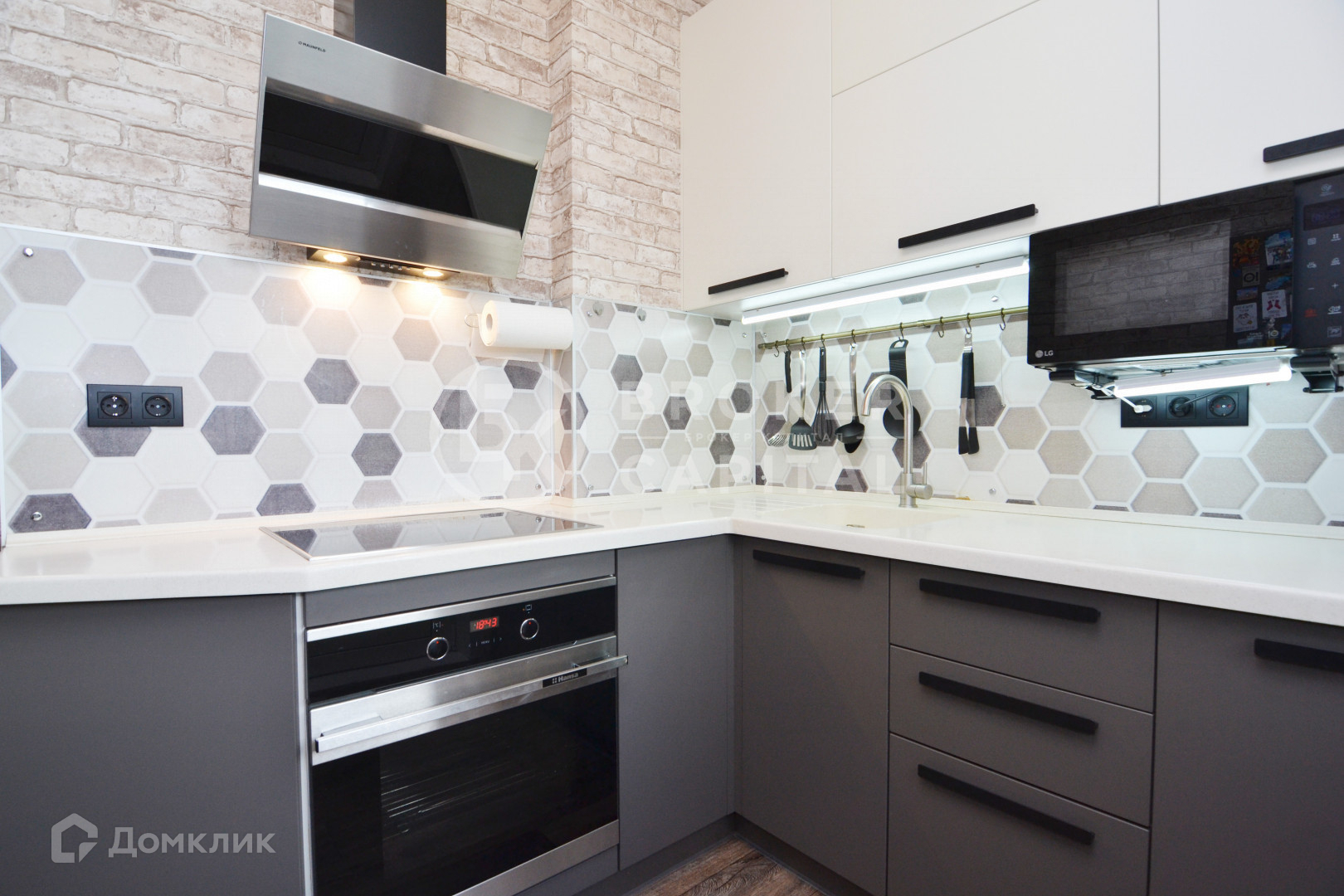 Новому собственнику остается мебель: кухонный гарнитур со всей встроенной техникой, духовым шкафом, варочной панелью и вытяжкой, шкафы, вся мебель в санузле.