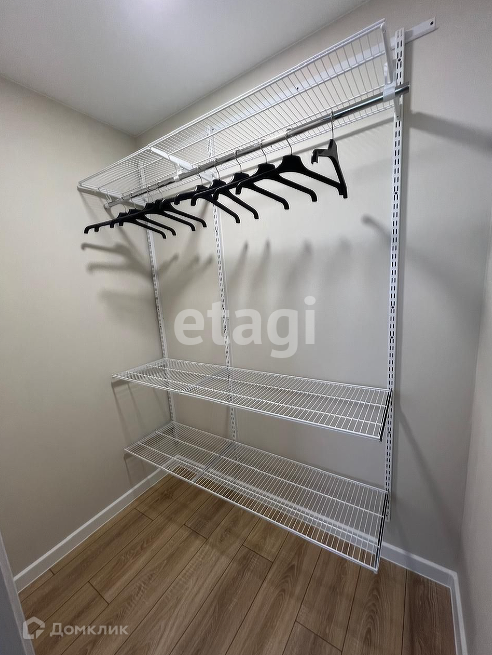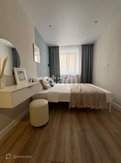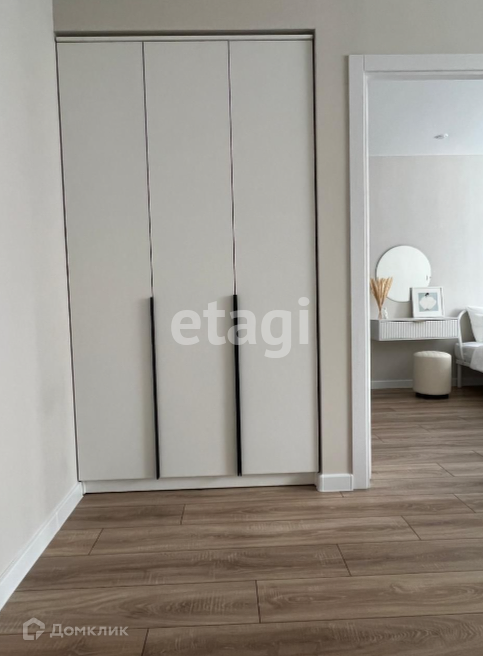 Спальня: двуспальная кровать, прикроватная тумба, туалетный столик, зеркало, пуф, гардеробная комната с местом под гладильную доску и пылесос.