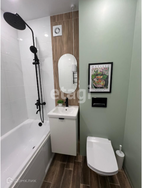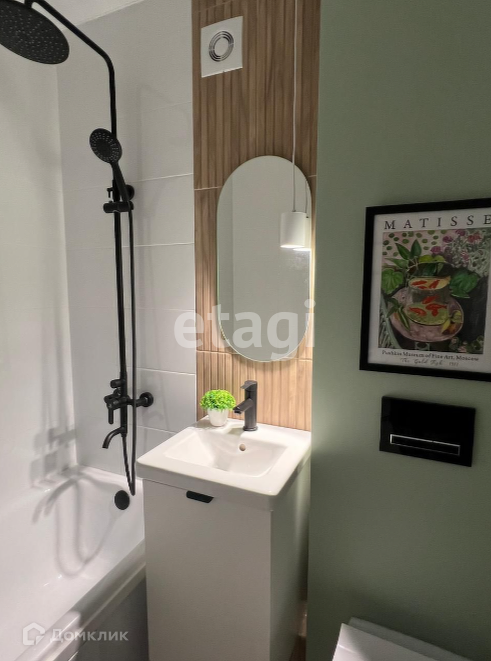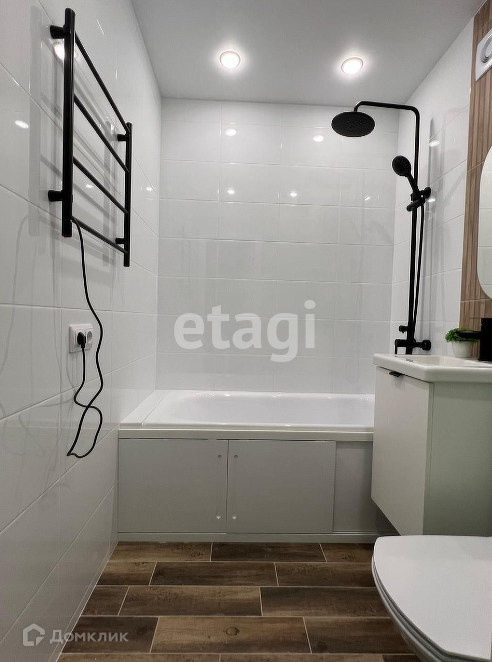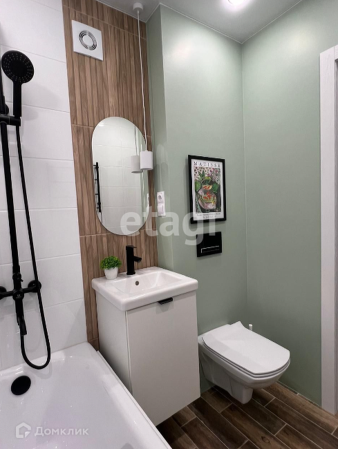 Санузел: электрический полотенцесушитель, выводы под стиральную машину, ванна, подвесной унитаз, отдельная подвесная раковина, зеркало.