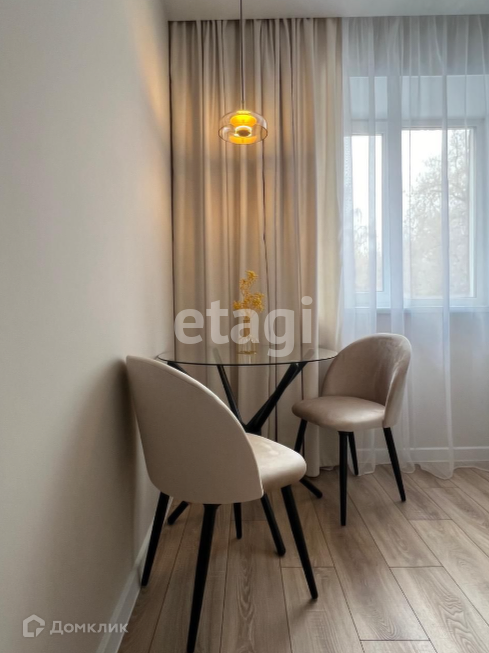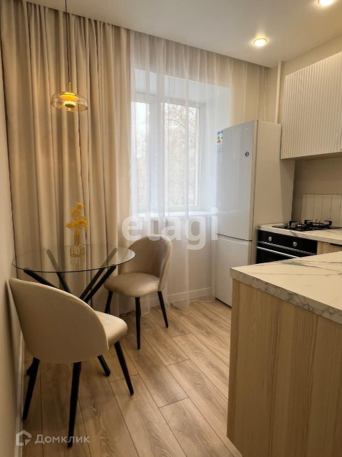 Кухня: встроенная на заказ, с духовым шкафом, микроволновой печью, посудомоечной машиной, газовой плитой; обеденный стол, стулья; холодильник.