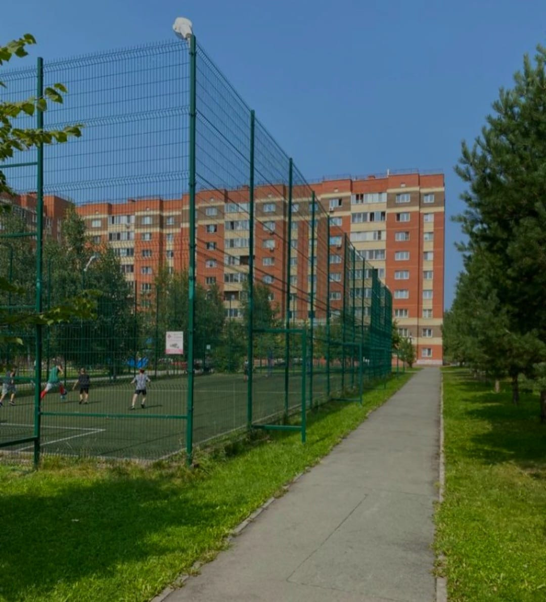 У дома большая охраняемая, закрытая придомовая территория 2Га, которая находится под видеонаблюдением, пропускной режим, две детские качественные площадки, футбольное поле с искусственным газоном, собственный сквер с дорожками для прогулок, бега и т.д. Просторные подъезды c видеонаблюдением, финские бесшумные лифты.