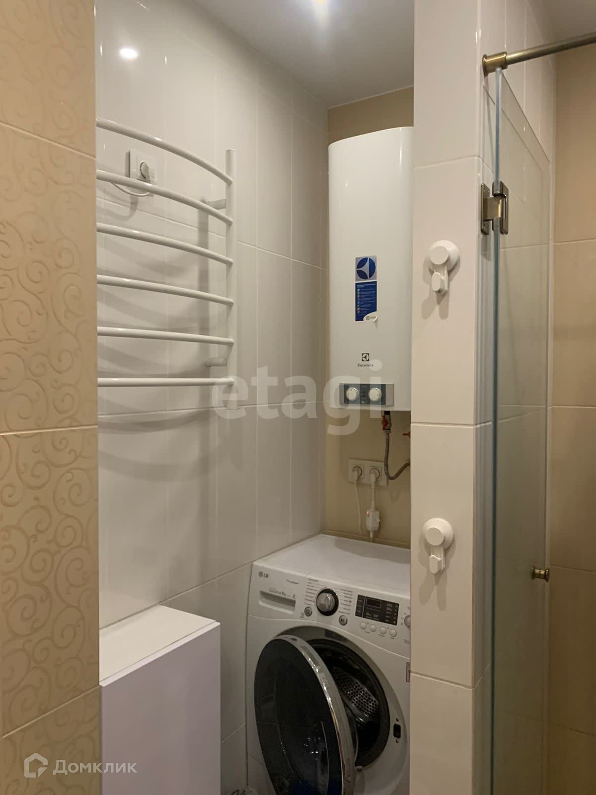 Во второй ванной комнате находится унитаз, душ, раковина, стиральная машина, водонагреватель и электрический полотенцесушитель.