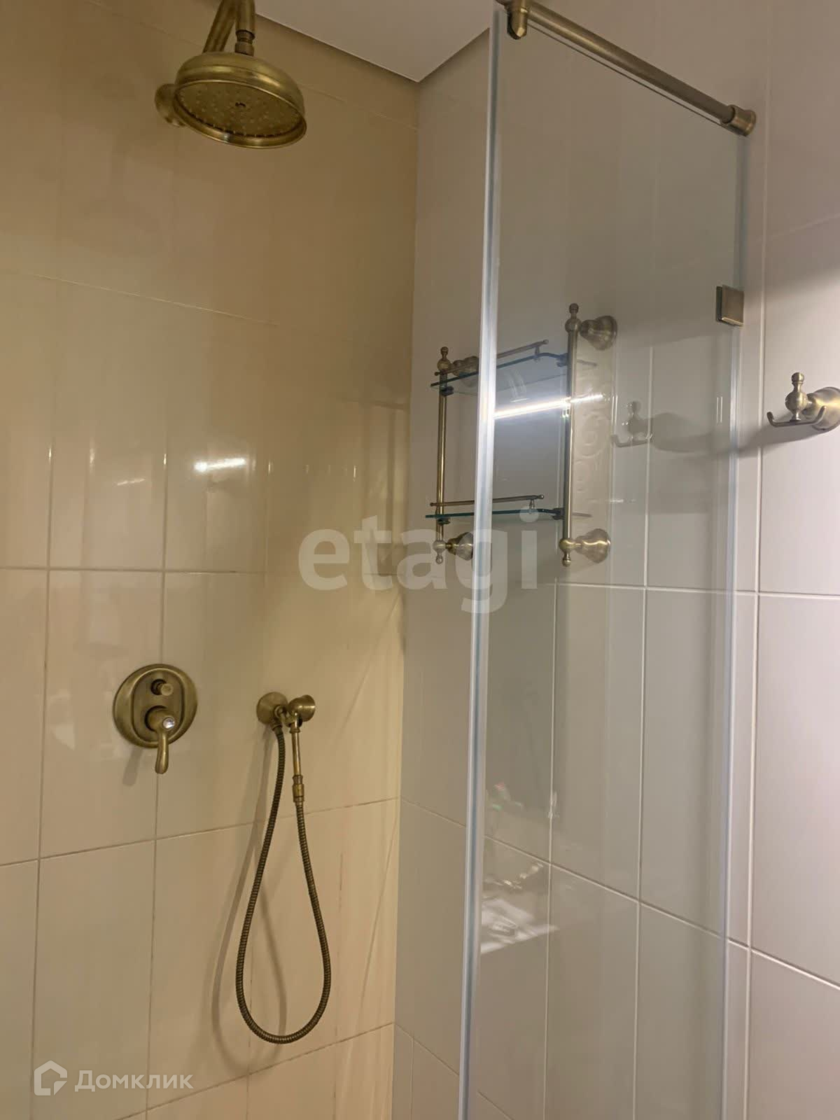 В одной находится большая ванна с зеркалом во всю стену, большая раковина с тумбочкой, унитаз, гигиенический душ, встроенные полки и телевизор.