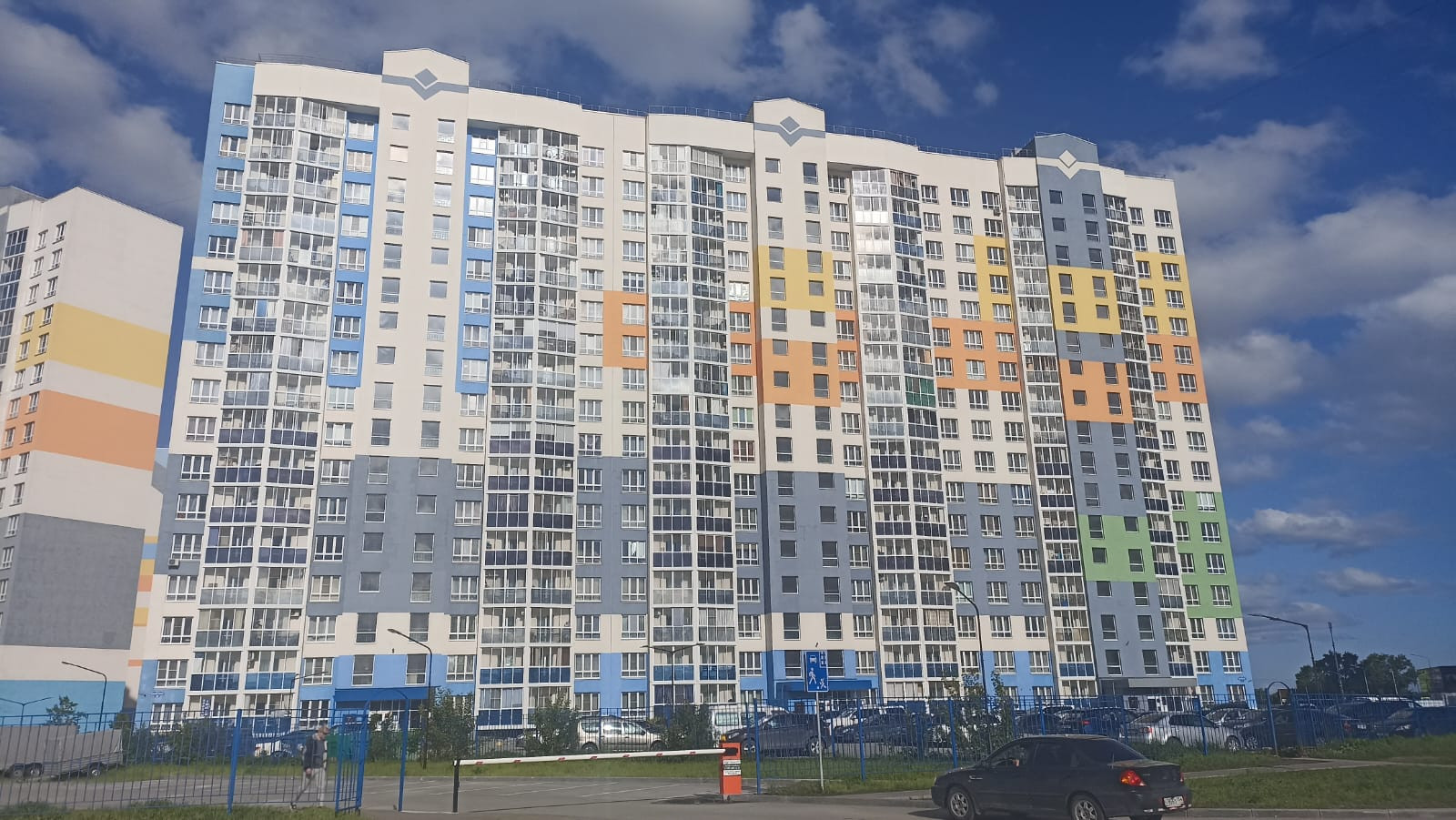 Закрытый двор, ворота со шлагбаумом, детская площадка, большой наземный паркинг.