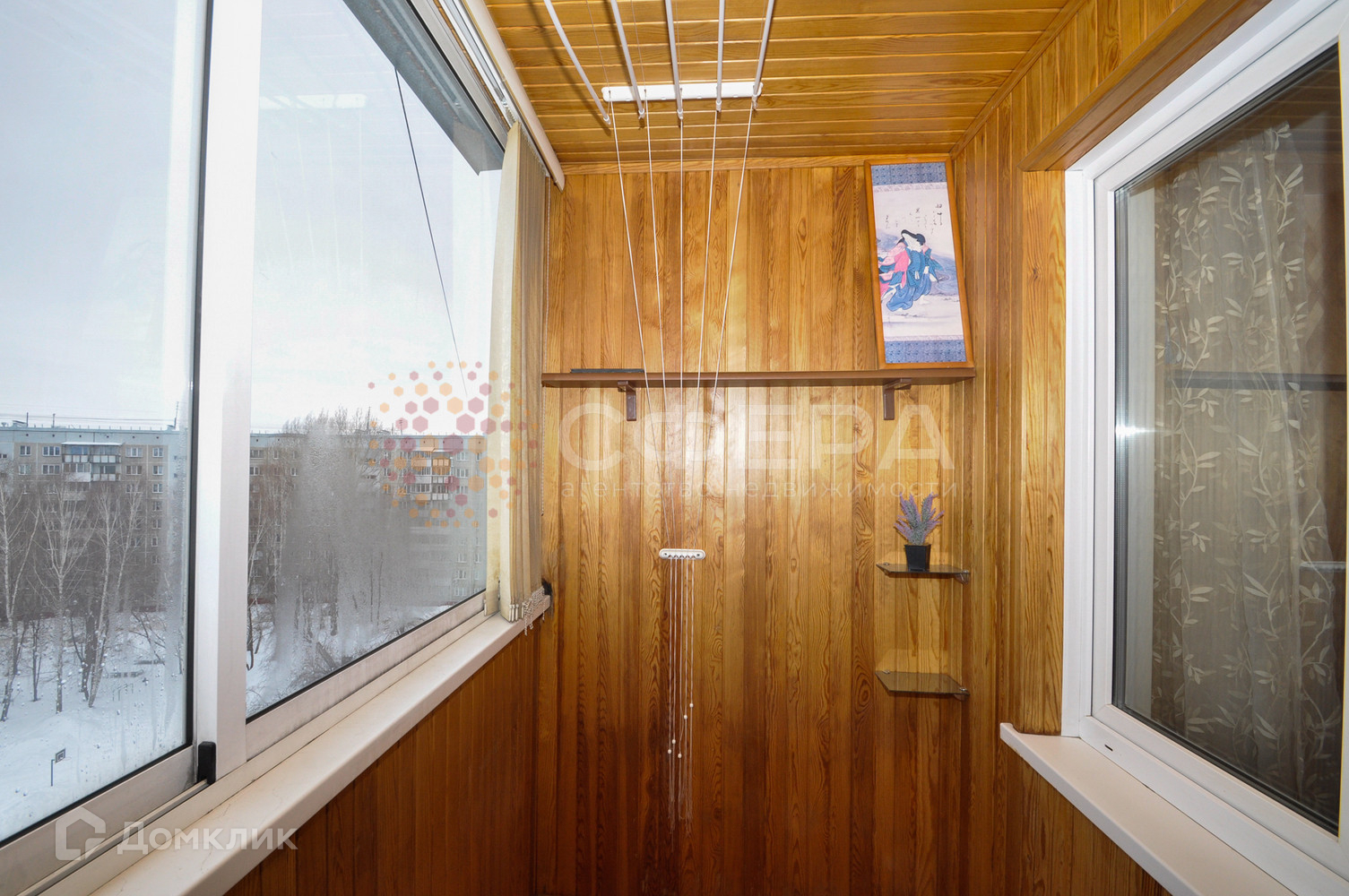 Лоджия с пластиковым остеклением, обшита рейкой, пол застелен плиткой. С лоджи открывается чудесный вид на город.