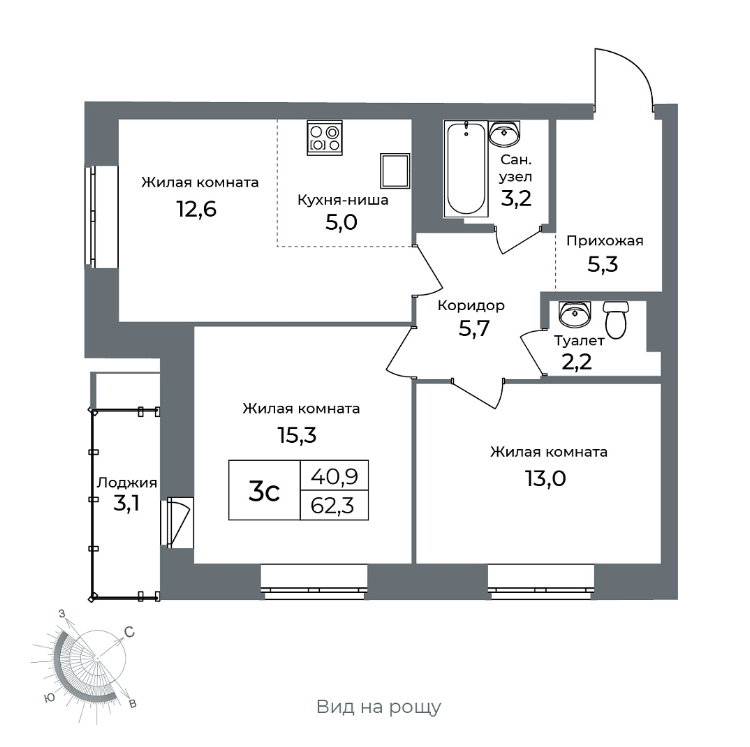Общая площадь 62.3 м2