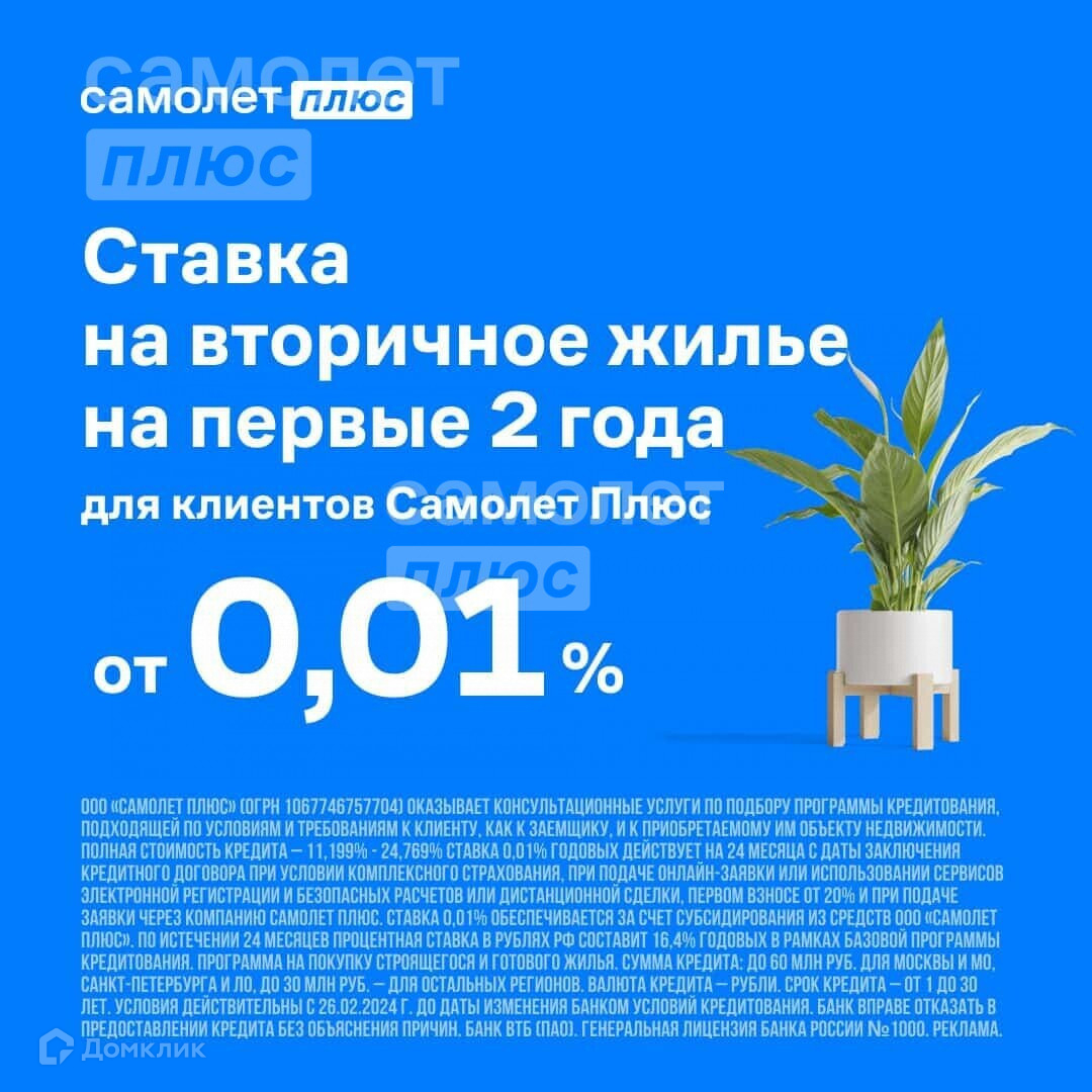 «ООО «Самолет Плюс» (ОГРН 1067746757704) оказывает консультационные услуги по подбору программы кредитования, подходящей по условиям и требованиям к Клиенту, как к заемщику и к приобретаемому им объекту недвижимости. Конкретные условия зависят от банка, программы кредитования и иных требований.»