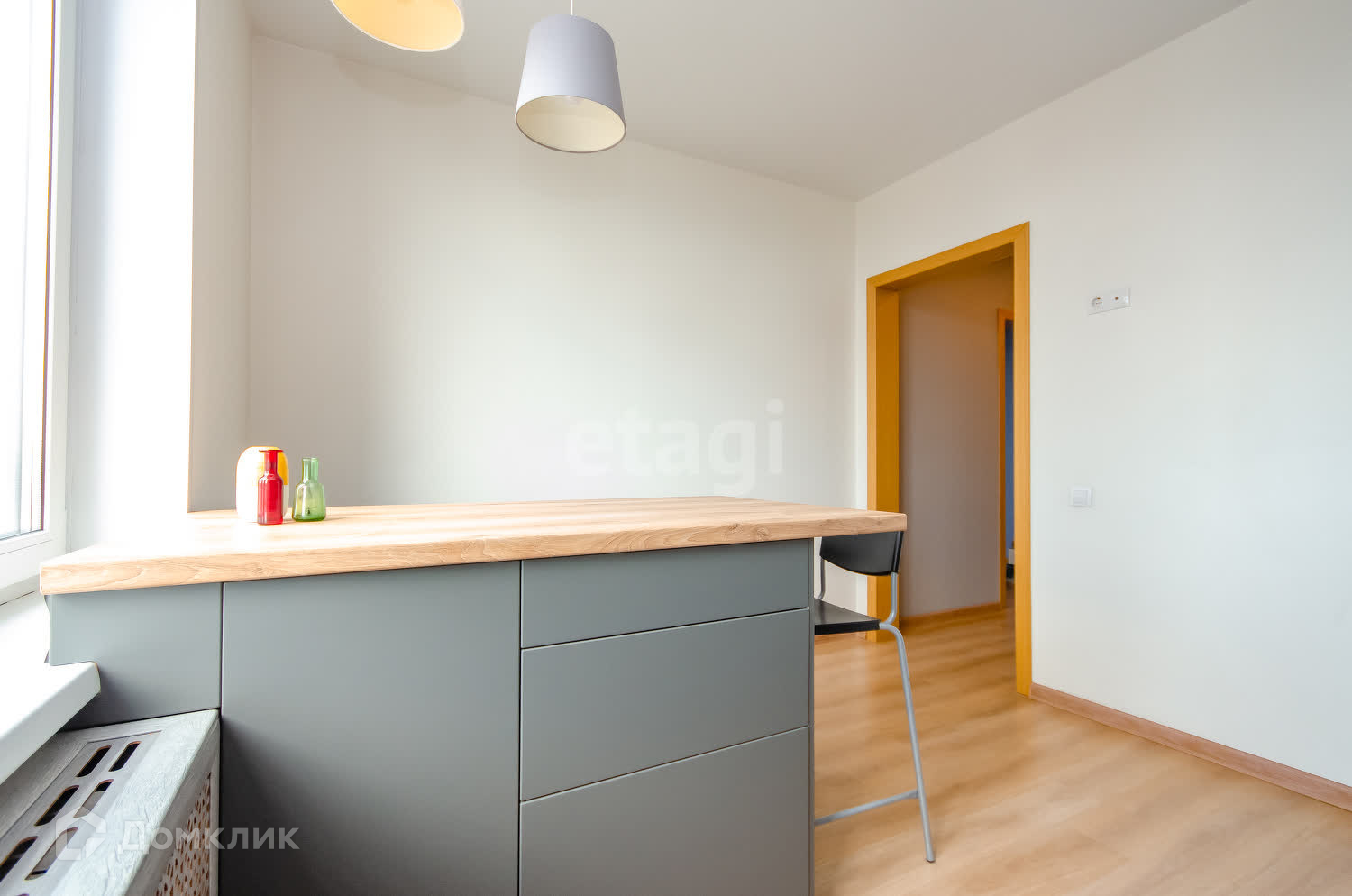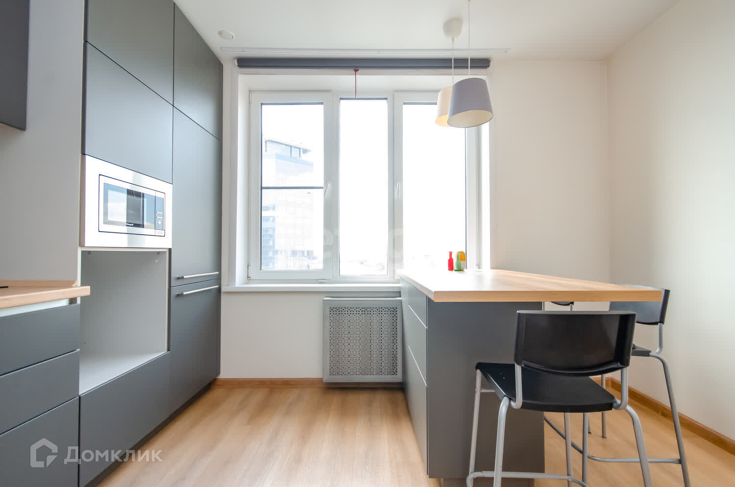 В подарок остается кухня, выполненная на заказ с встроенным холодильником, СВЧ-печью, двухконфорочной варочной поверхностью из стеклокерамики и вытяжкой. Остров со встроенными местами для хранения, может использоваться как стол для приготовления блюд, так и для приёма пищи. Моечная зона оборудована встроенным фильтром воды, на стене под мойкой выведена розетка для подключения измельчителя пищевых отходов.