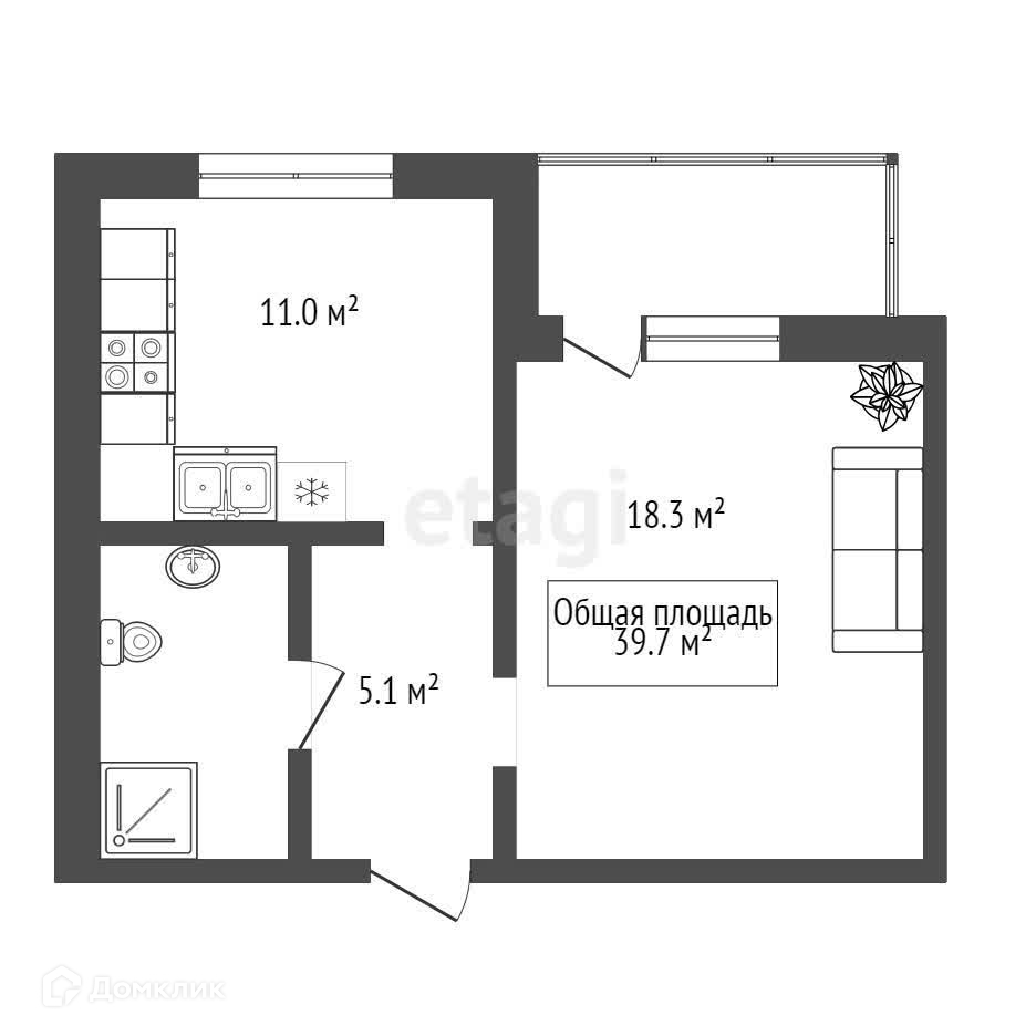 Общая площадь 39.7 м2