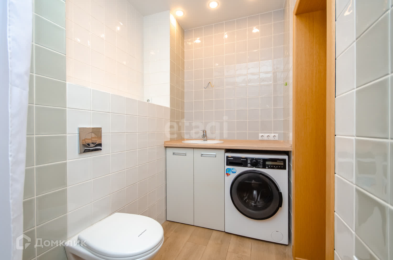 В санузле оборудована большая душевая зона с отдельным освещением, предусмотрена ниша для водонагревателя и / или установки полок и дверец, также в ванной комнате электрический теплый пол и вытяжной вентилятор.
