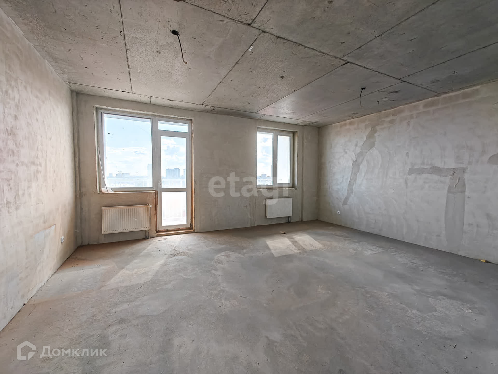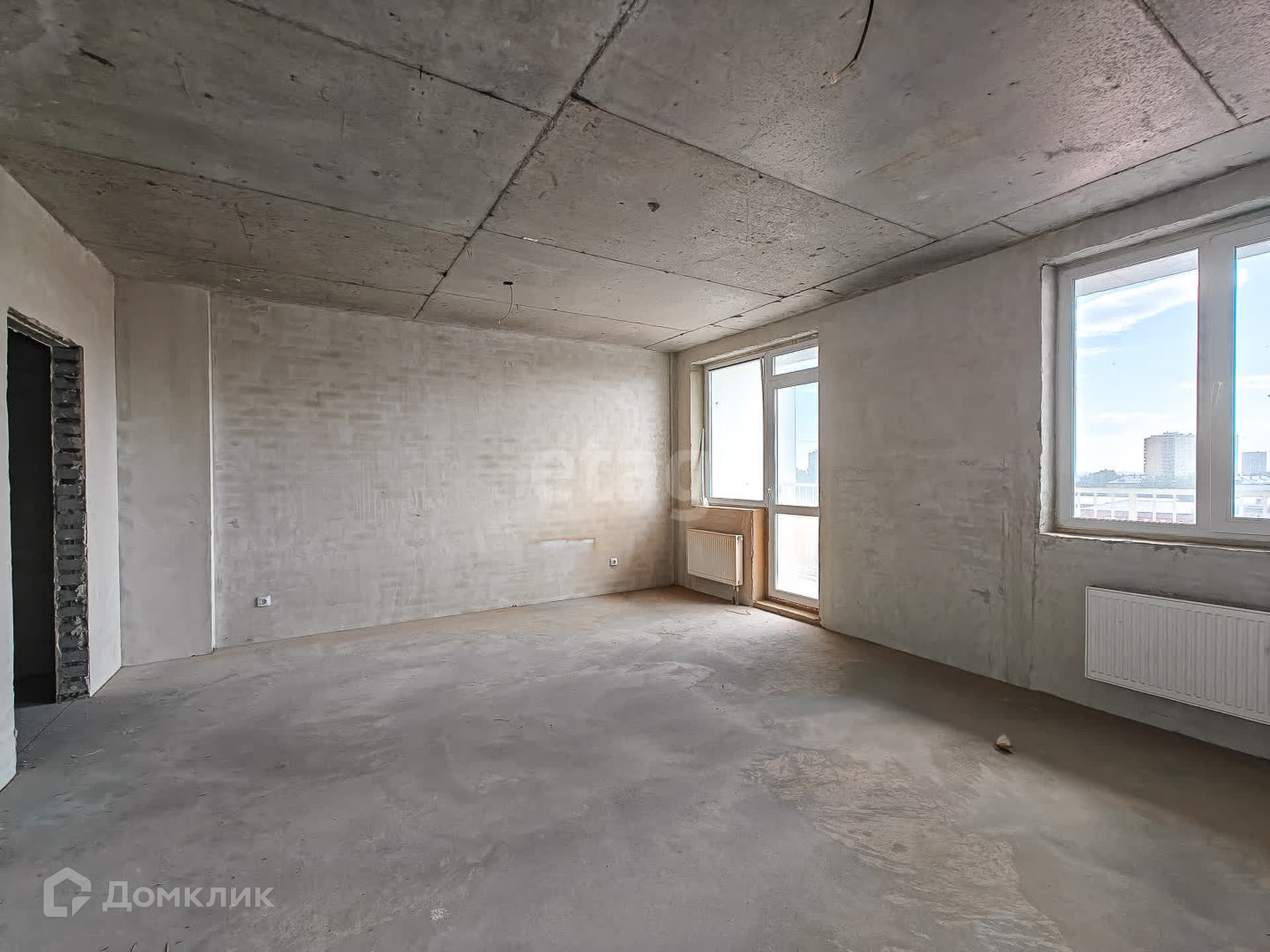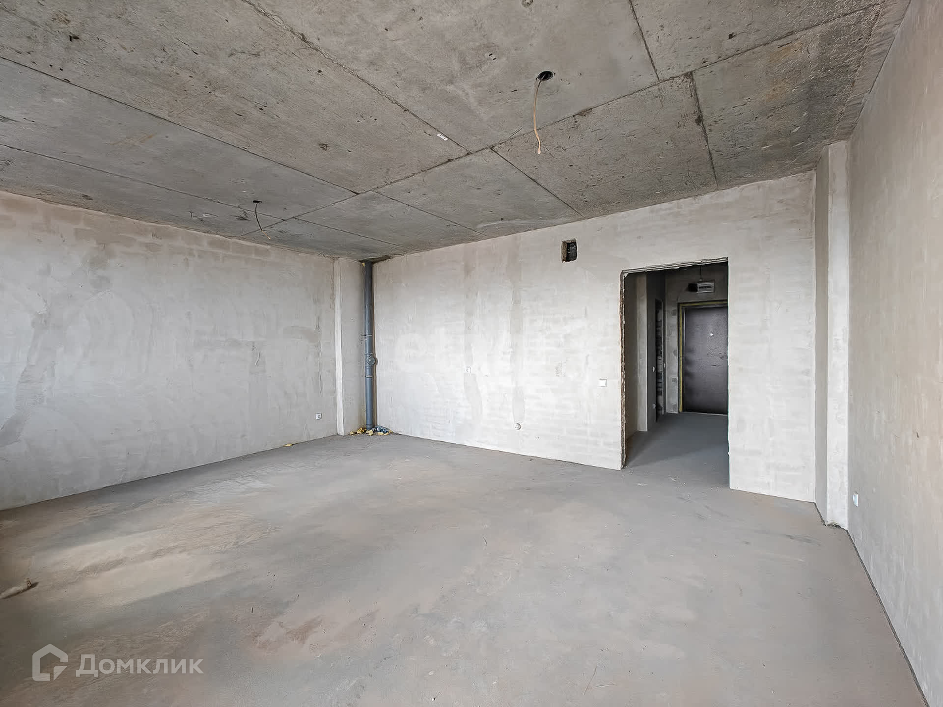 В квартире выполнена подготовка к ремонту: залита стяжка пола, стены выровнены, оштукатурены, потолок ровный.