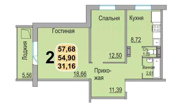 Общая площадь 54.96 м2