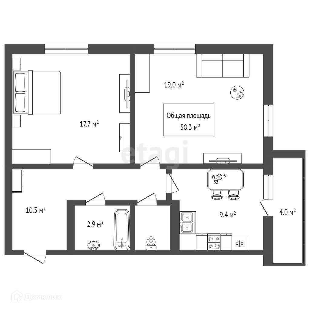 Общая площадь 58.3 м2