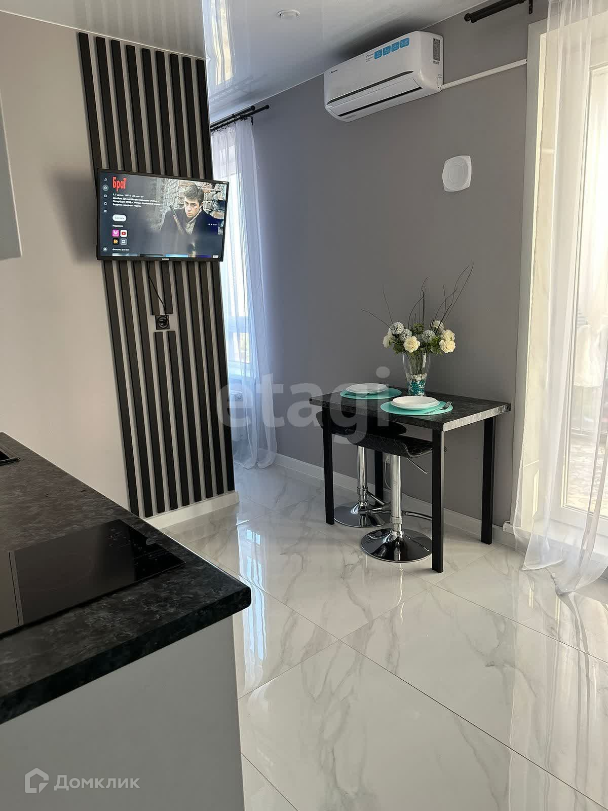 Выполнен ремонт по дизайн проекту, на полу по всей квартире и санузле дорогой керамогранит. Установлена современная мебель и бытовая техника. Вся бытовая и мебель новая.