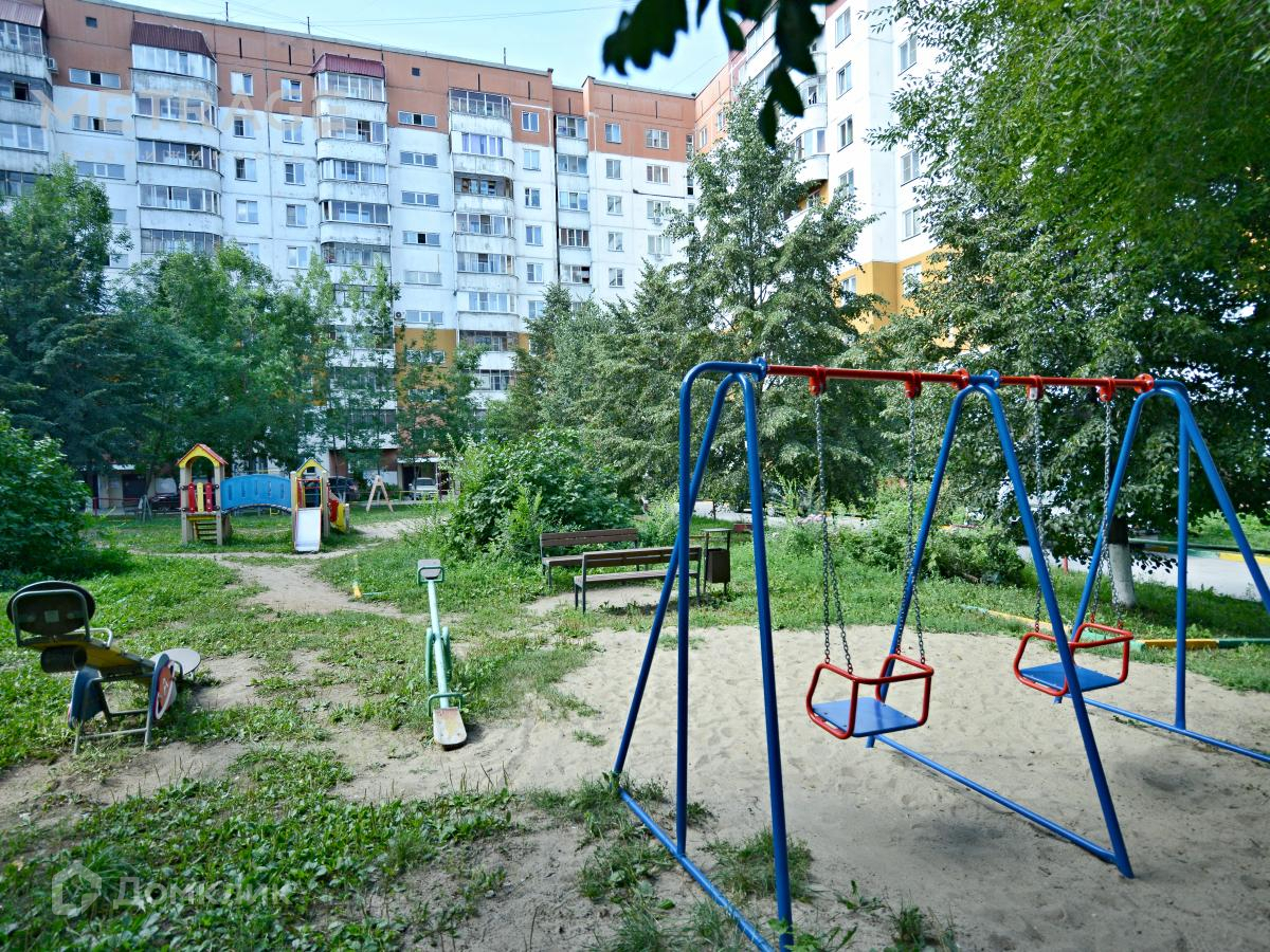 - Во дворе дома есть детская площадка с качелями, песочницей и другими игровыми элементами среди зелёных деревьев, что создаёт приятное пространство для отдыха детей и их родителей.