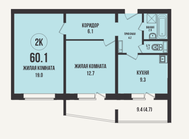 Общая площадь 60.1 м2