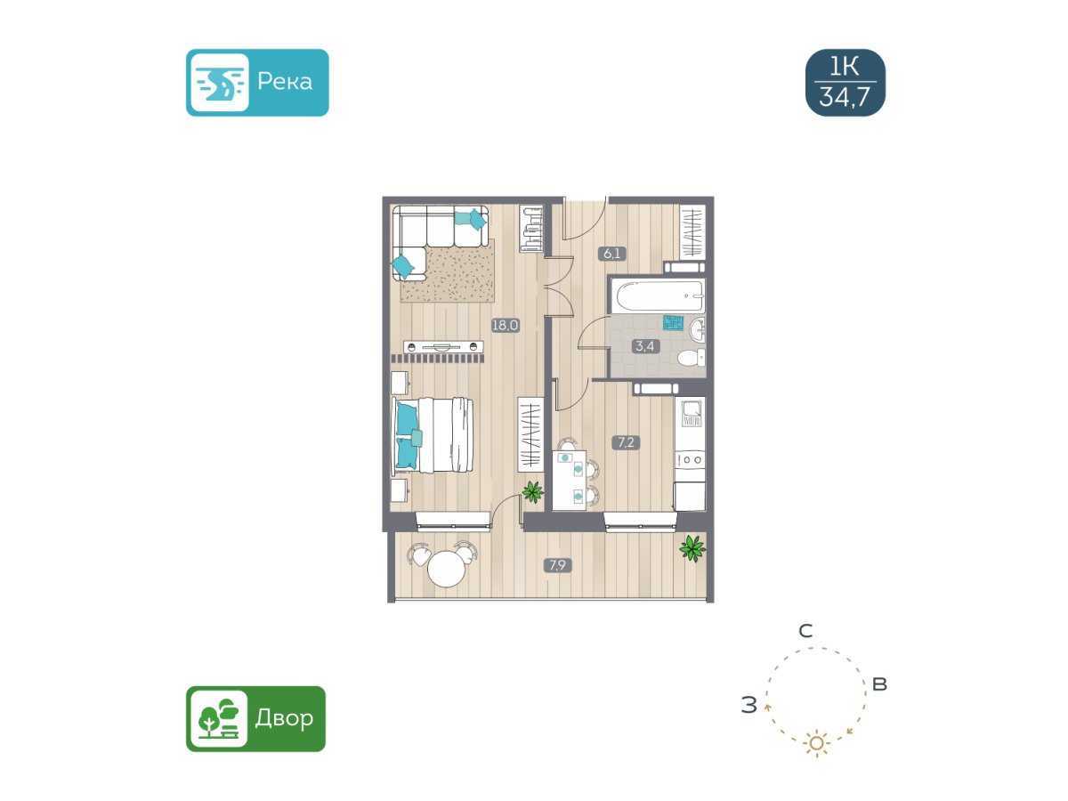 Общая площадь 34.7 м2