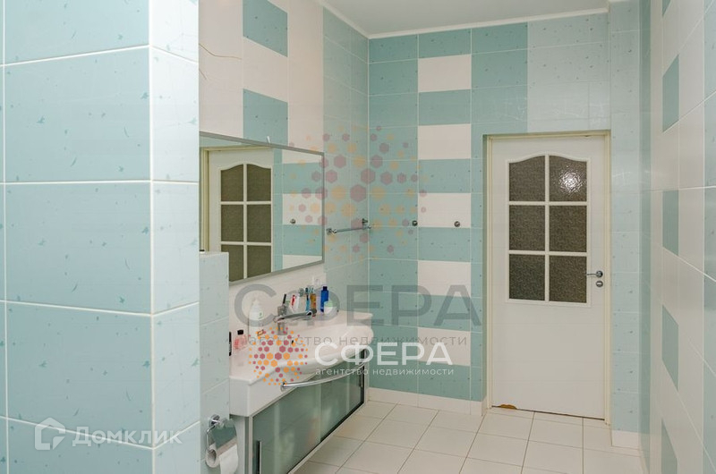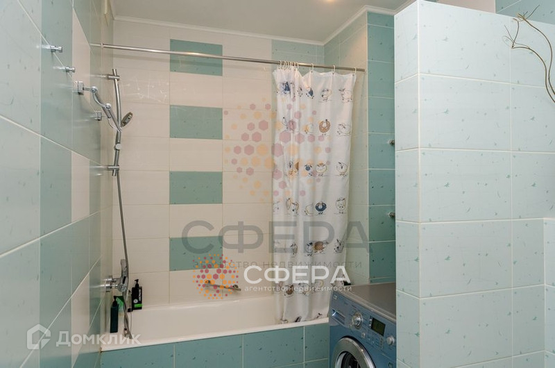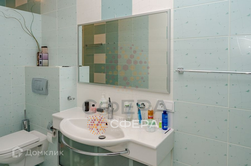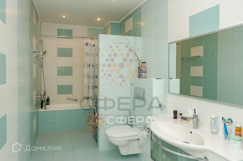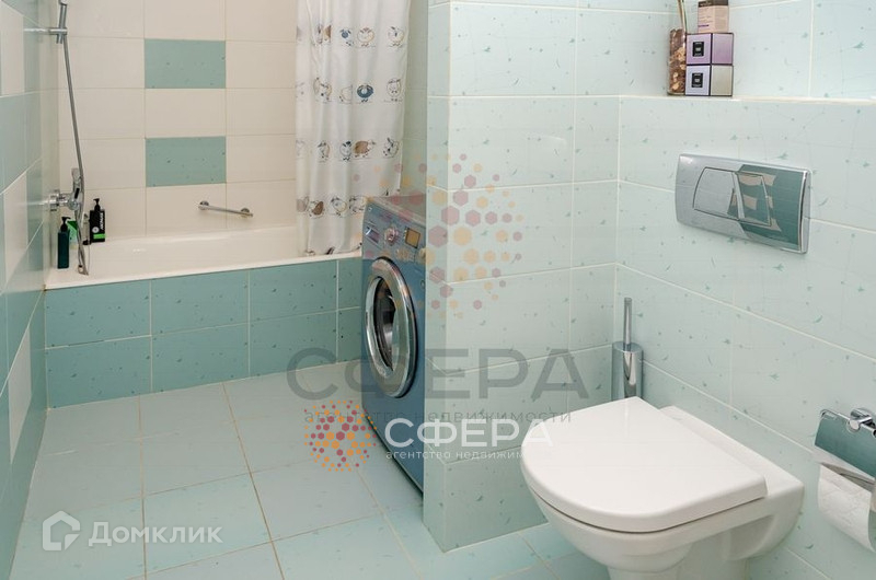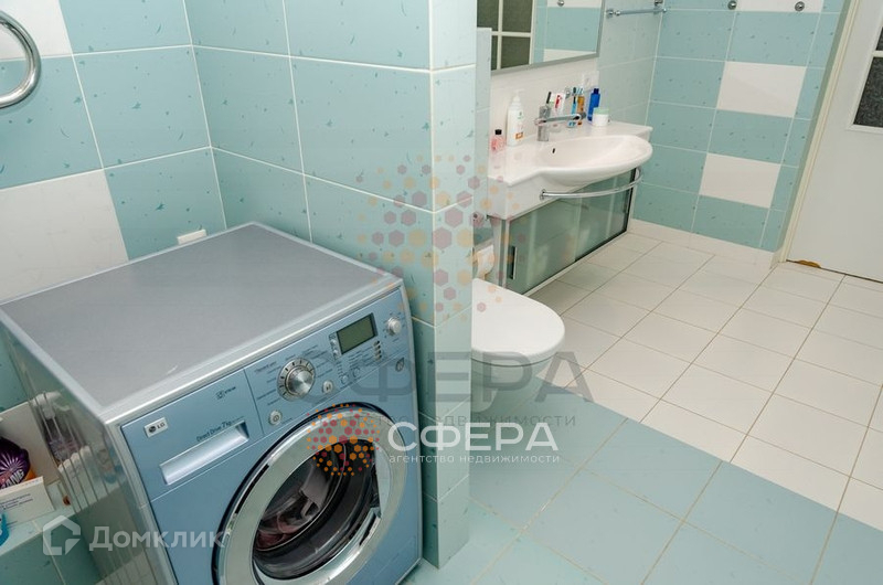 Санузел совмещенный, отделан кафелем светло-бирюзового цвета. Установлена большая раковина с тумбой, зеркало, инсталляция, стиральная машина, ванна.