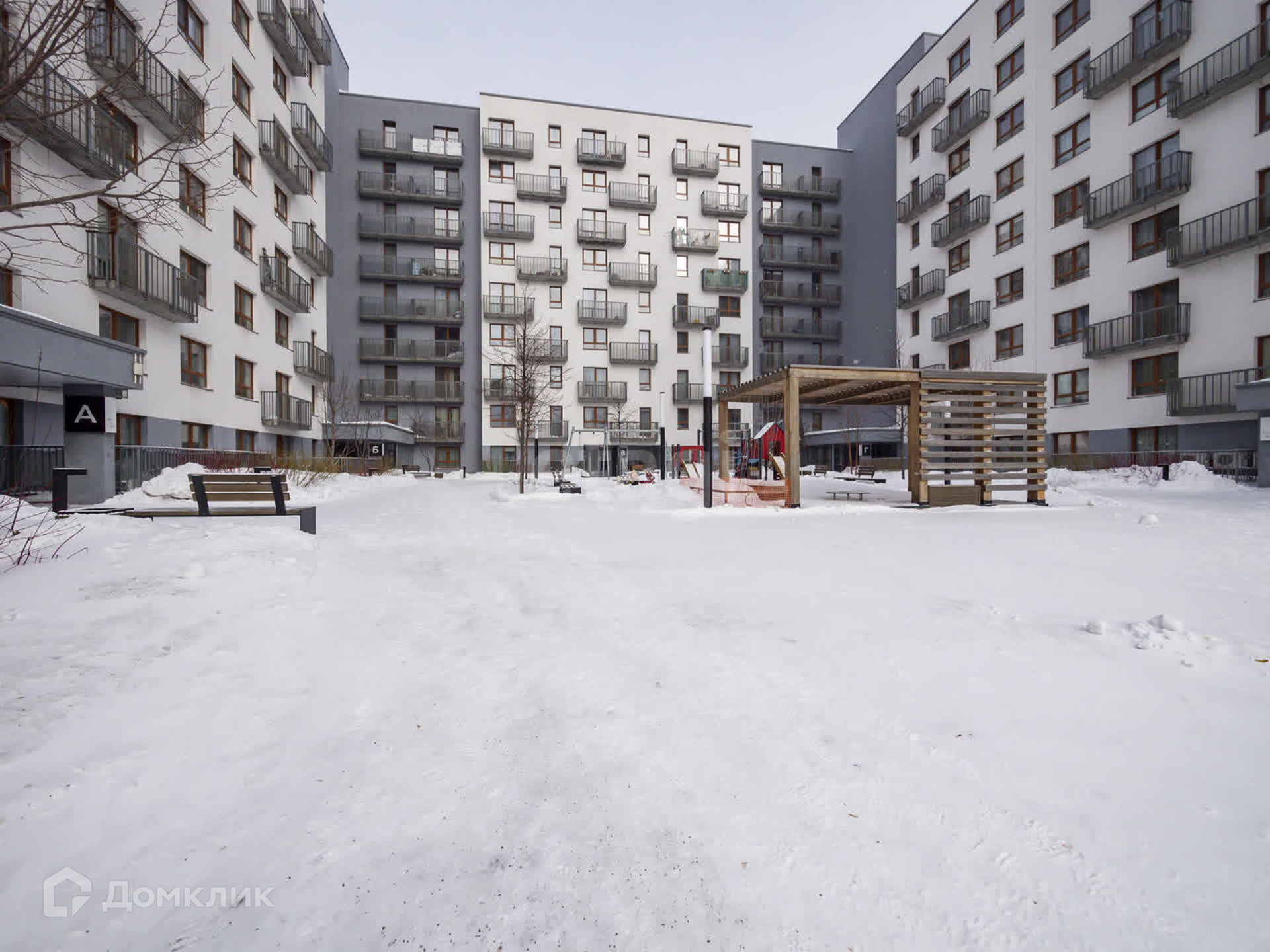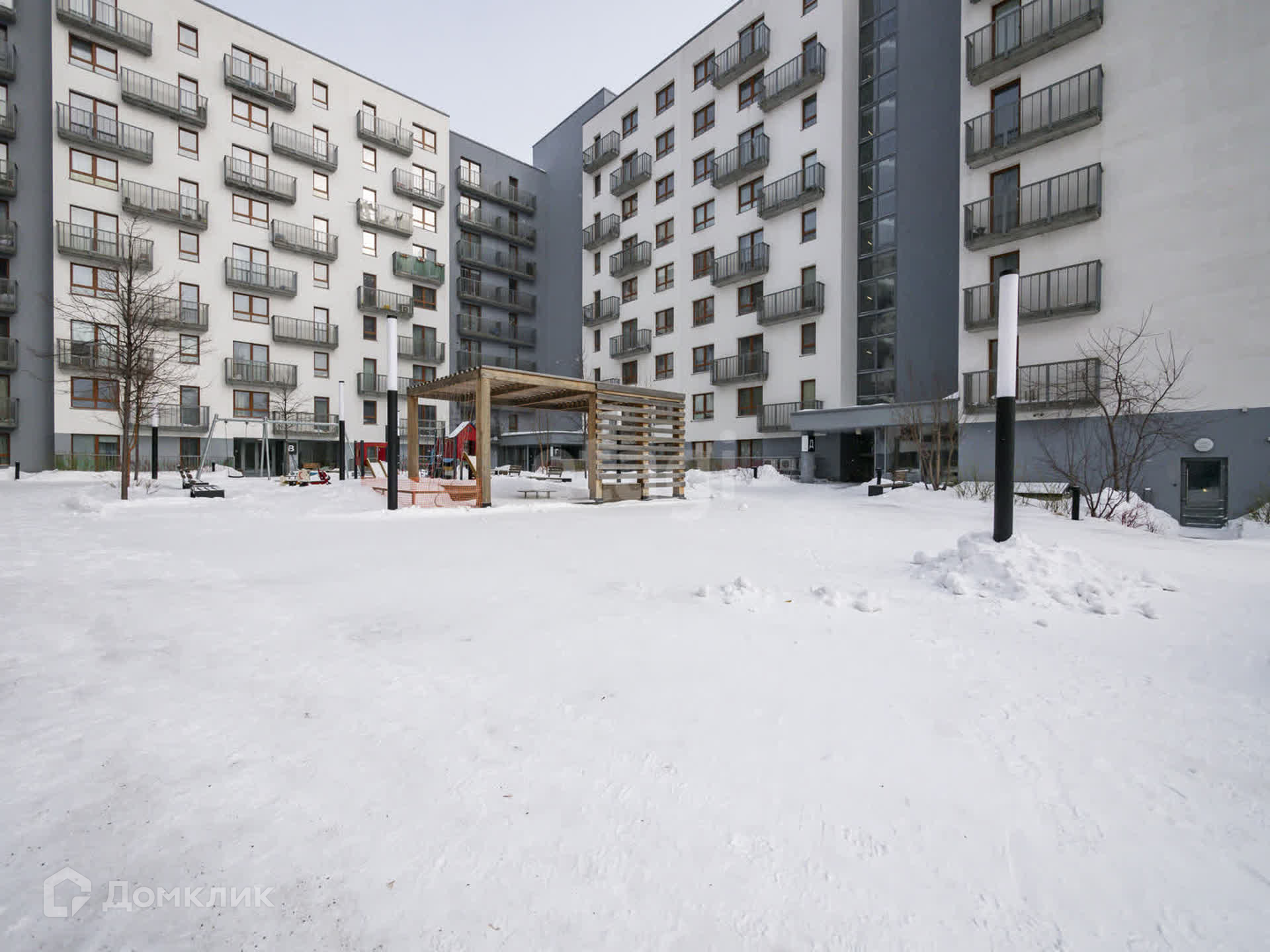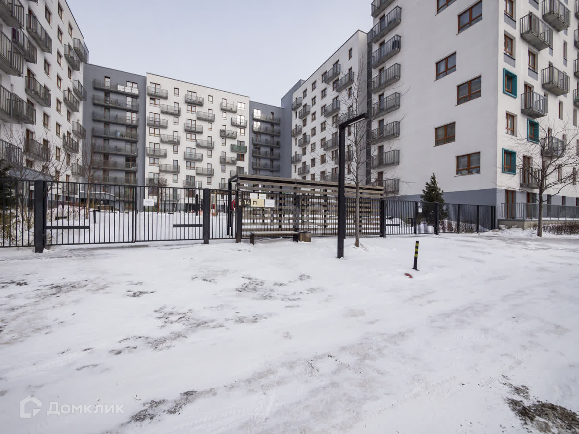 Двор без машин, детская площадка, парковка, вся необходимая инфраструктура в шаговой доступности, при этом район продолжает развиваться дальше.