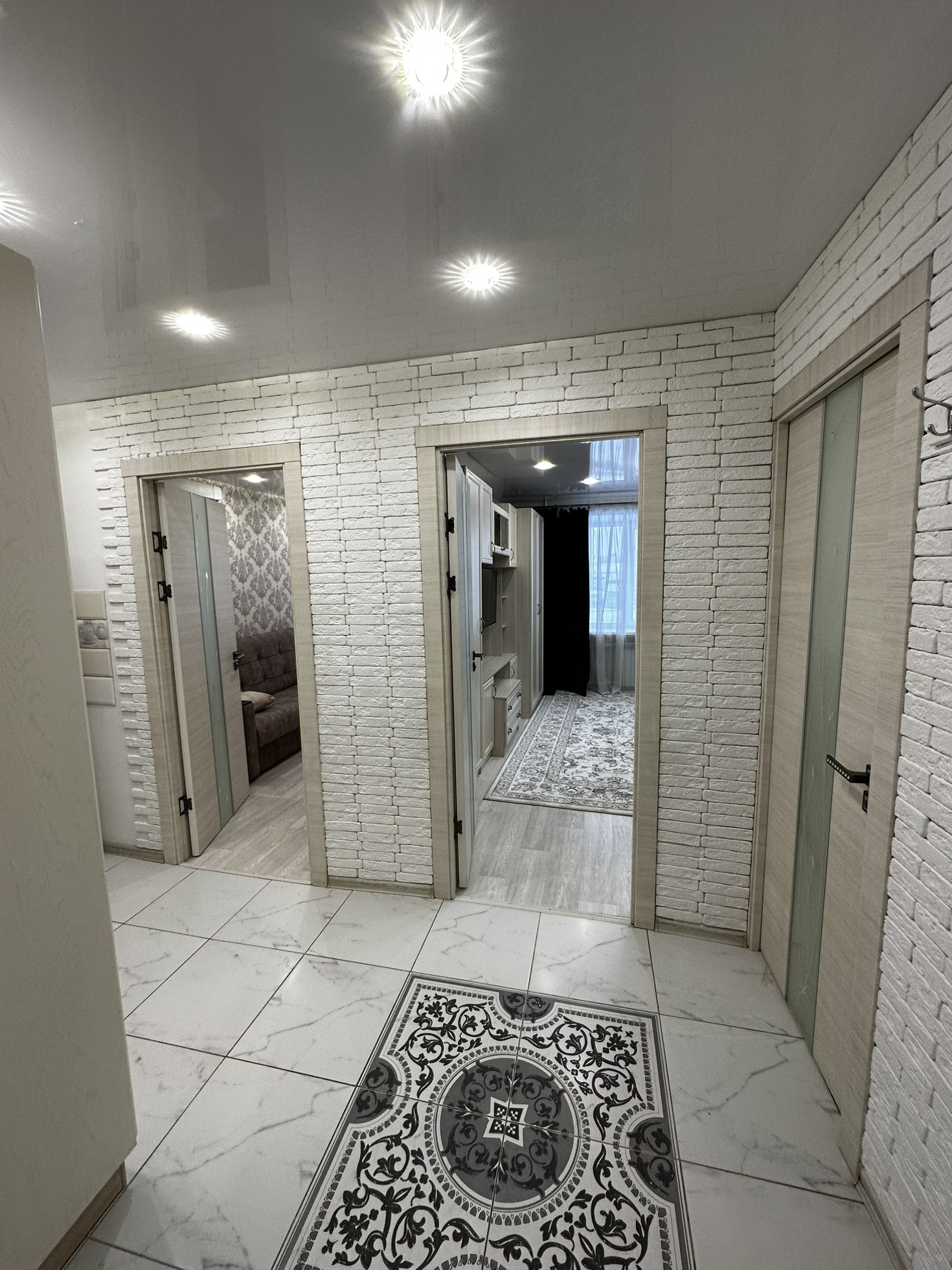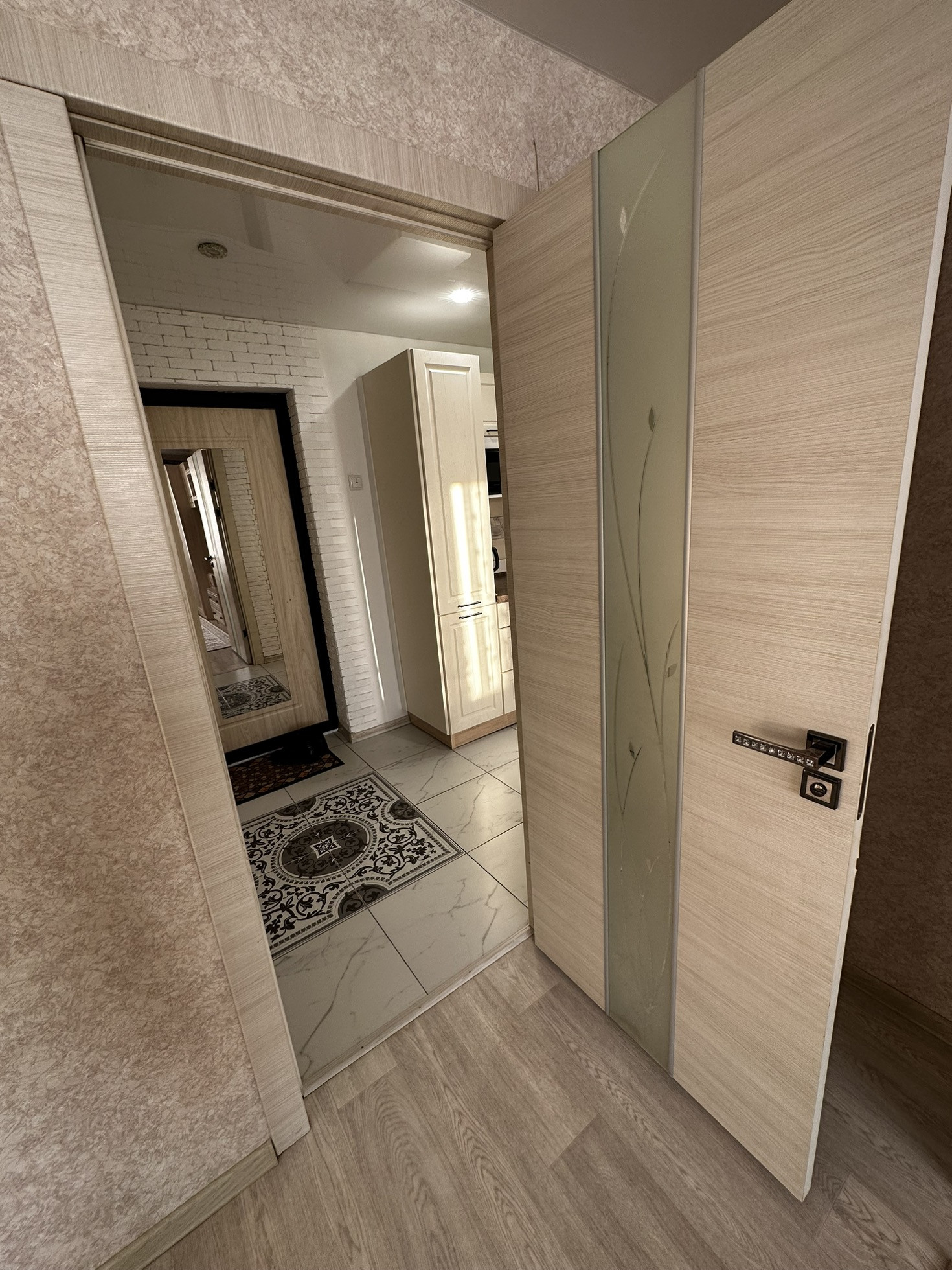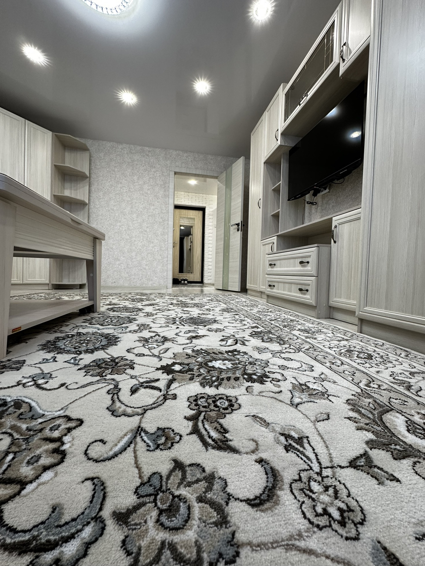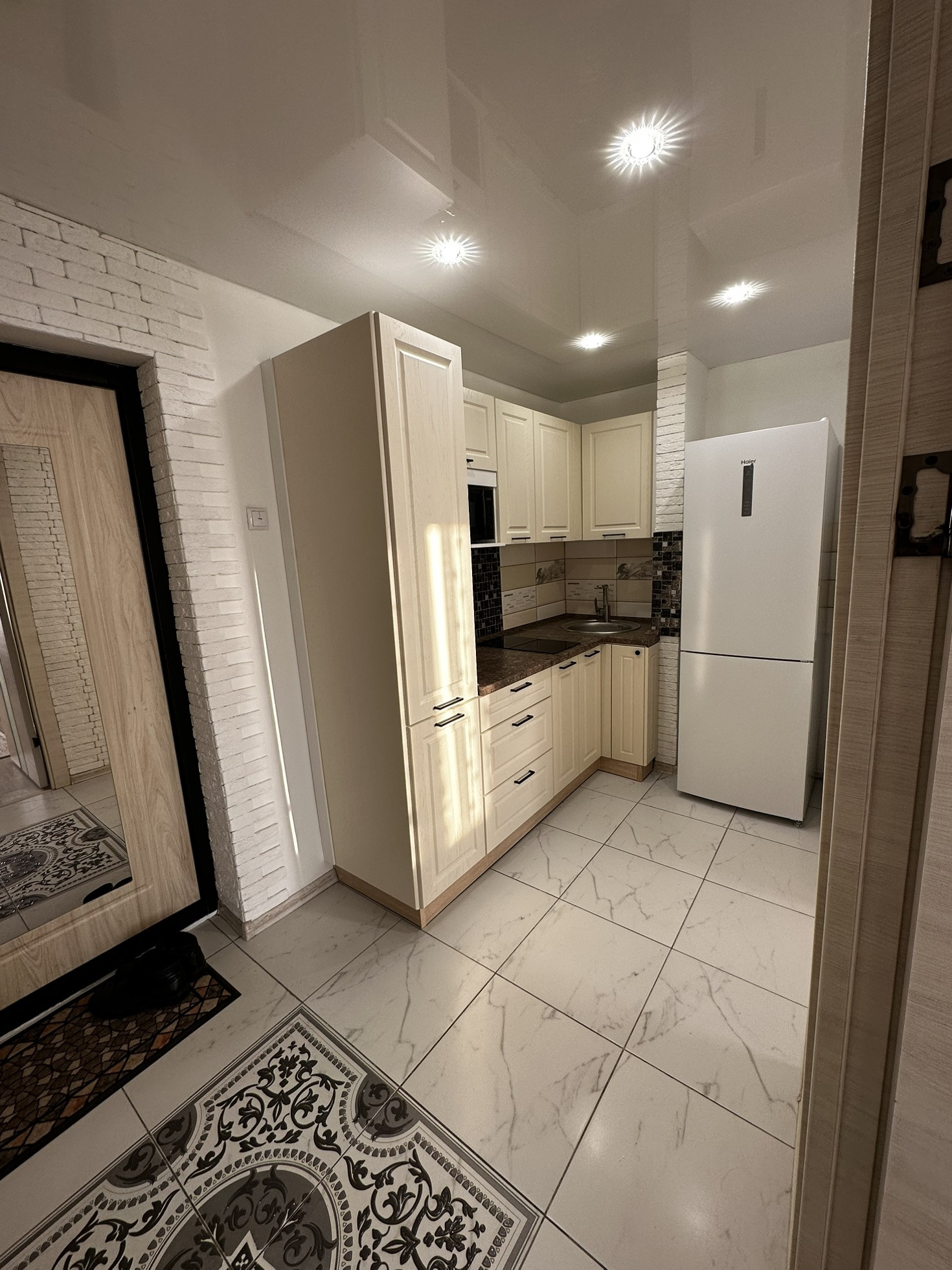 В квартиру установлена хорошая входная дверь с шумоизоляцией, потолки по всей квартире натяжные глянцевые, освещение спроектировано по зонам, спальная зона и зона для работы размещены далеко чтобы не мешать, над кухонной зоной свое освещение. В прихожей зоне и зоне кухни на полу уложили керамогранит, в жилой зоне линолеум хорошего качества Tarkett. В ванной кафельная плитка до потолка, новая трубная разводка воды и канализации, раковина и вся сантехника в отличном состоянии, душевая система и кабина со стеклянными стенками.