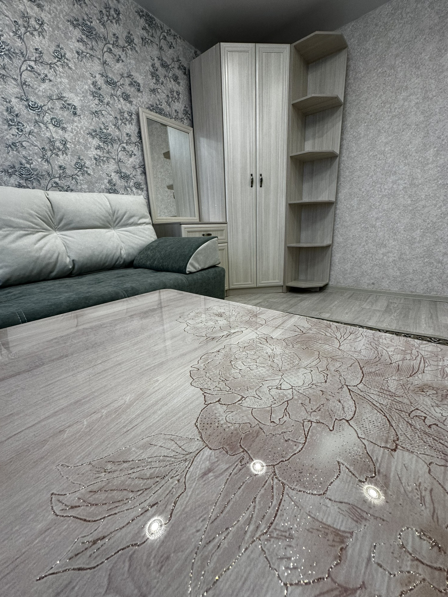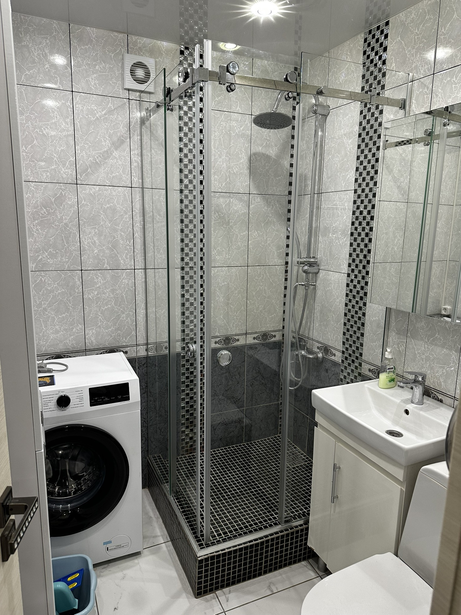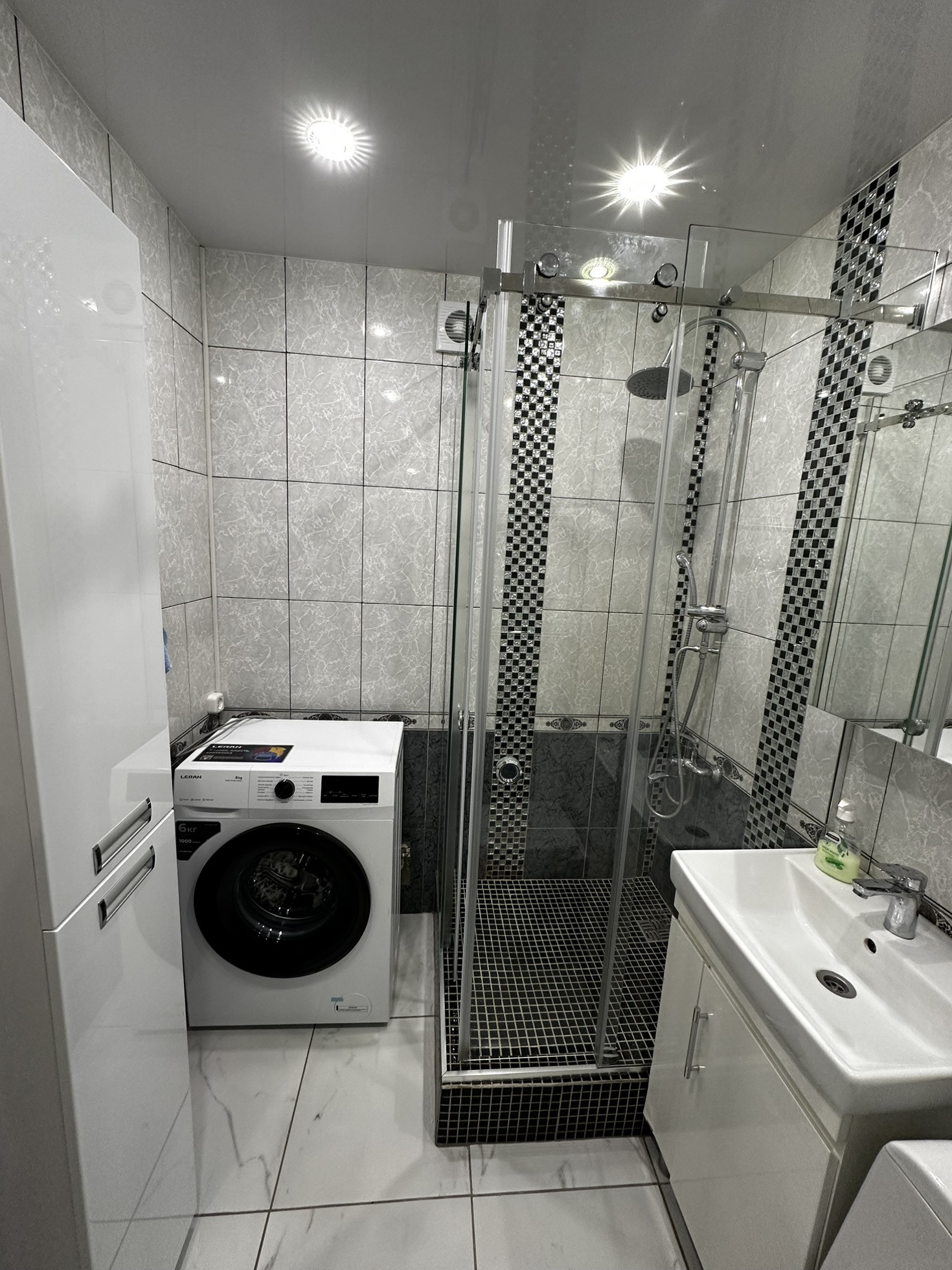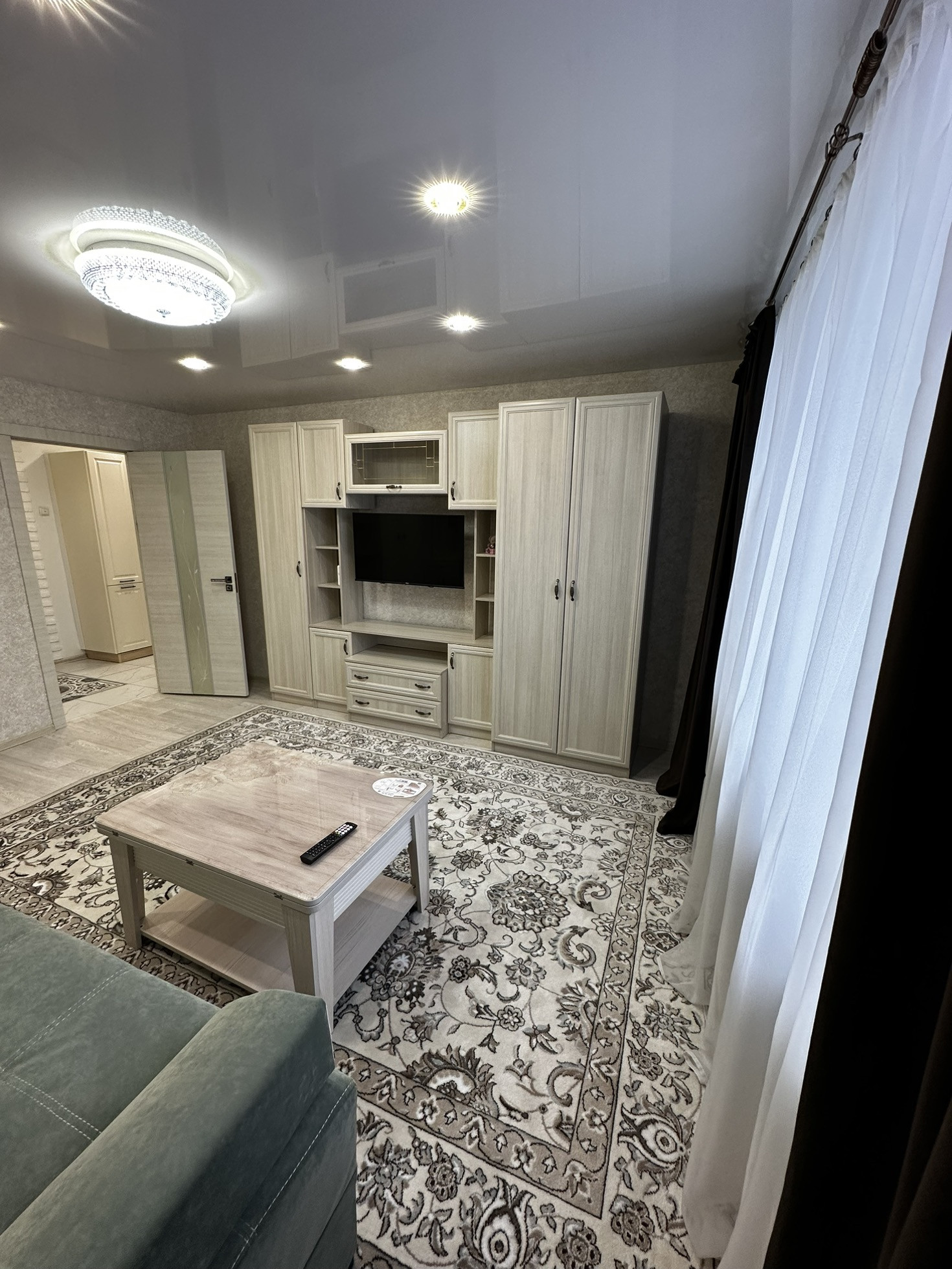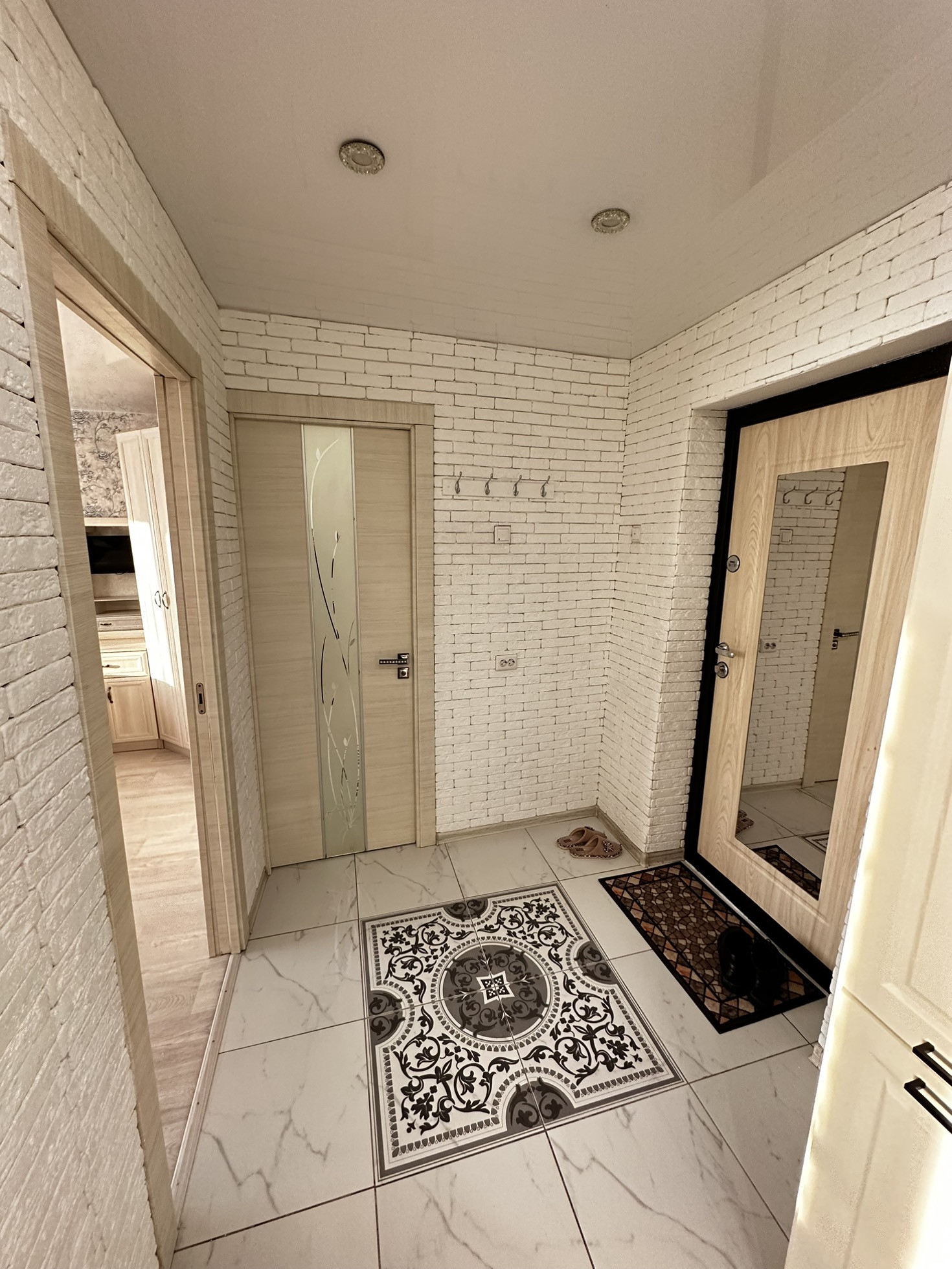 В квартиру установлена хорошая входная дверь с шумоизоляцией, потолки по всей квартире натяжные глянцевые, освещение спроектировано по зонам, спальная зона и зона для работы размещены далеко чтобы не мешать, над кухонной зоной свое освещение. В прихожей зоне и зоне кухни на полу уложили керамогранит, в жилой зоне линолеум хорошего качества Tarkett. В ванной кафельная плитка до потолка, новая трубная разводка воды и канализации, раковина и вся сантехника в отличном состоянии, душевая система и кабина со стеклянными стенками.