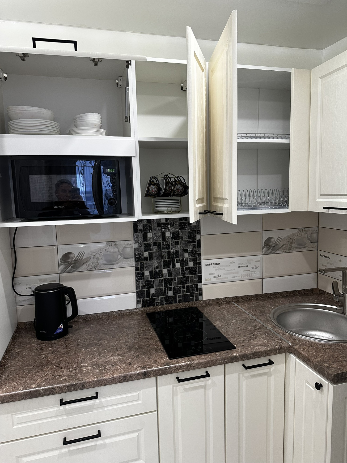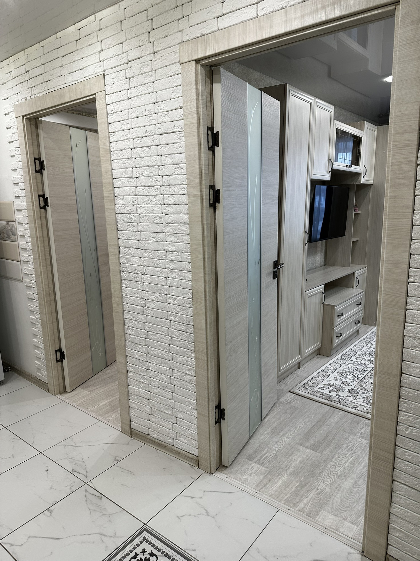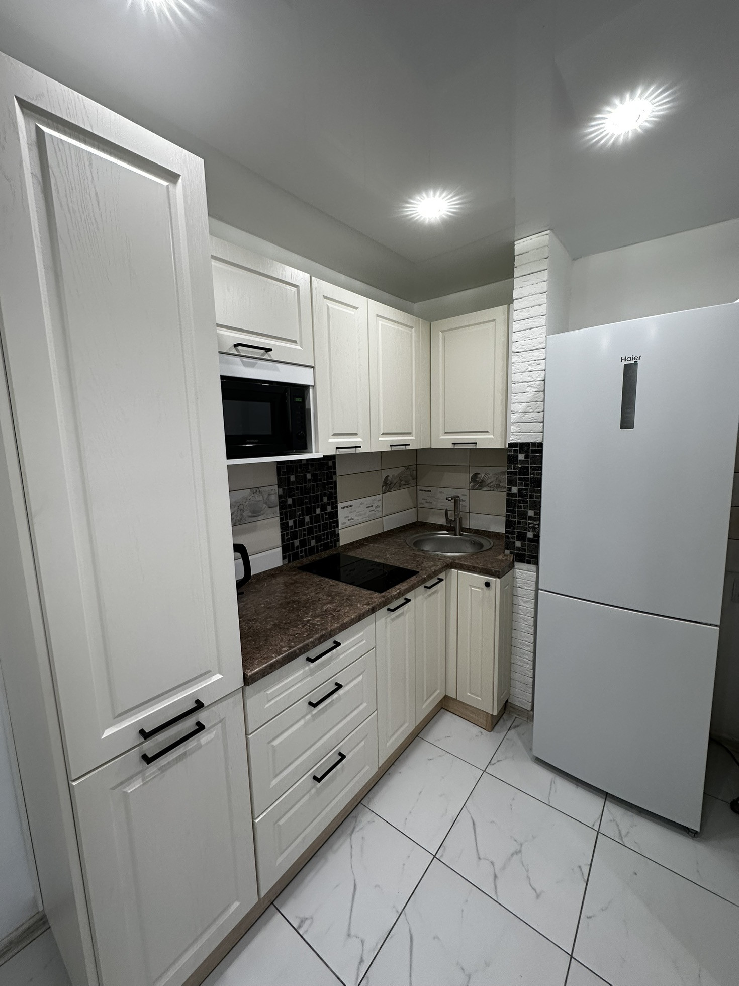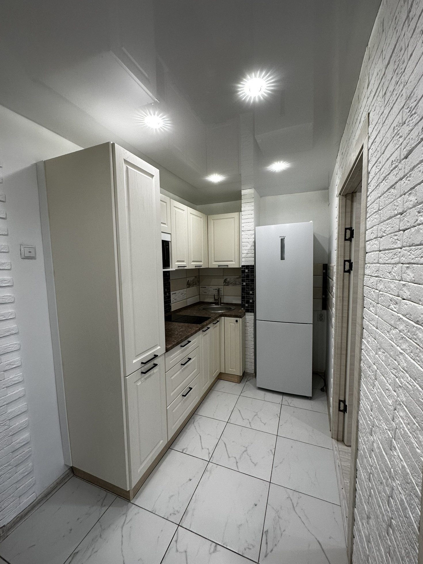 В квартиру установлена хорошая входная дверь с шумоизоляцией, потолки по всей квартире натяжные глянцевые, освещение спроектировано по зонам, спальная зона и зона для работы размещены далеко чтобы не мешать, над кухонной зоной свое освещение. В прихожей зоне и зоне кухни на полу уложили керамогранит, в жилой зоне линолеум хорошего качества Tarkett. В ванной кафельная плитка до потолка, новая трубная разводка воды и канализации, раковина и вся сантехника в отличном состоянии, душевая система и кабина со стеклянными стенками.