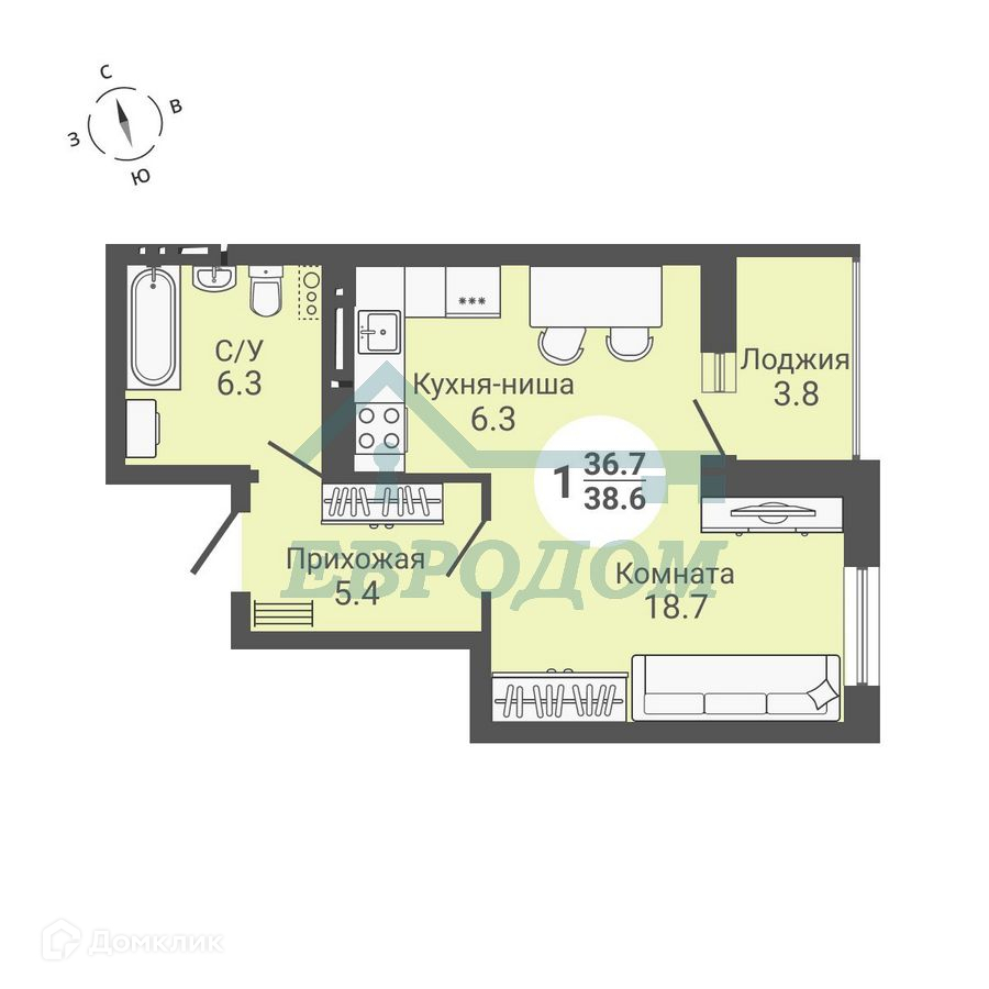 Общая площадь 36.7 м2